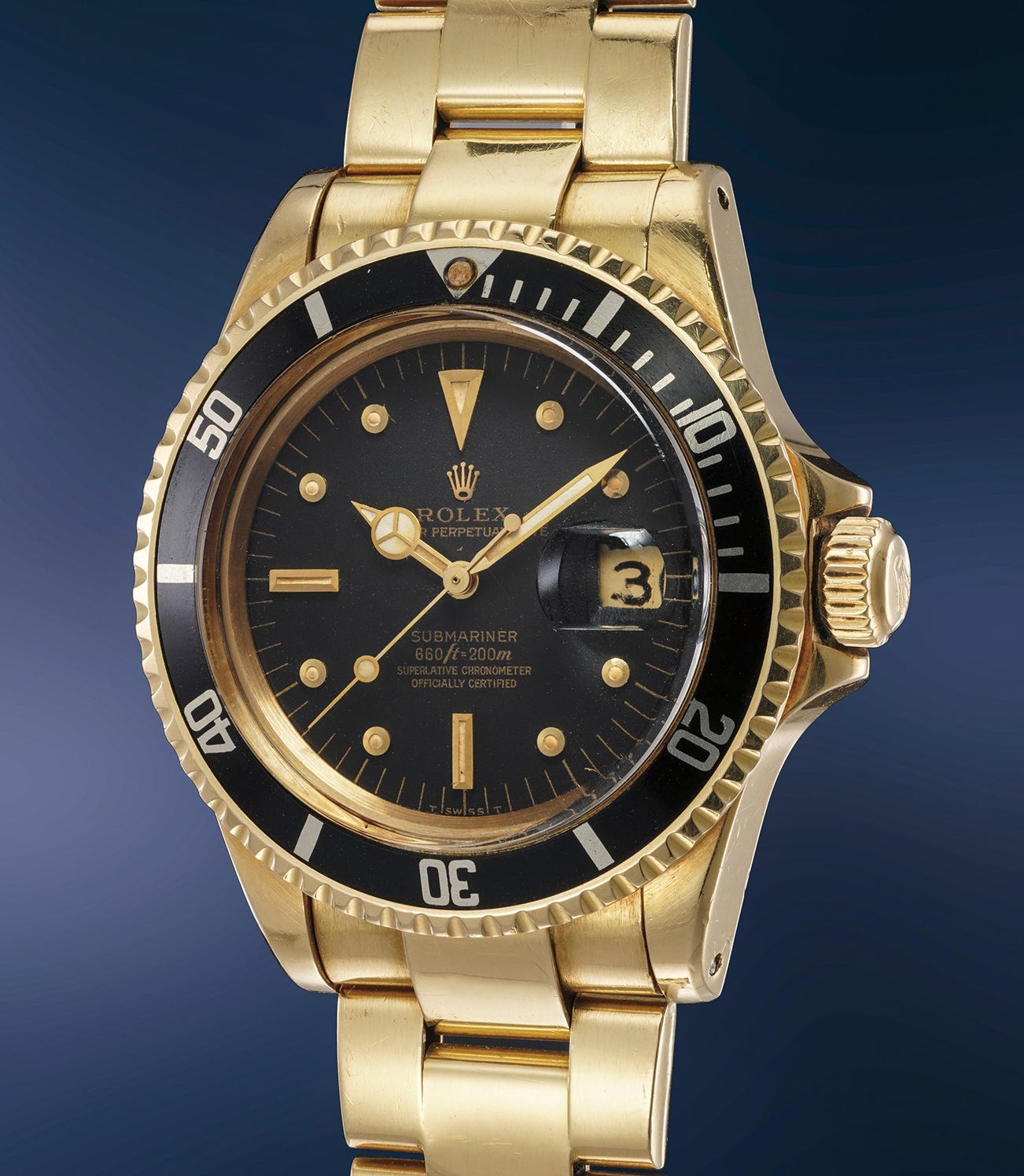 The dial witnessed on the reference differs from its stainless steel examples as it features numerals now playfully known as "nipple indexes", conical gold markers with a small lume-filled opening at the top. Furthermore, very early examples featured Mark I "meters first" depth rating with later examples with "feet first" depth rating. With the switch from meters first to feet first taking place in the early 2.4 million, the present 2'497'827 example is one of the very earliest representative of MKII dial.