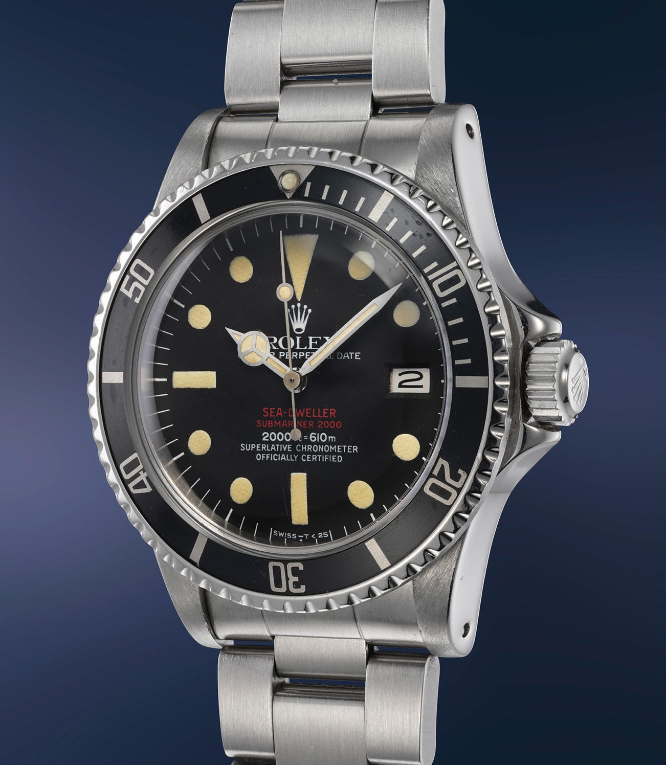 The watch featured a triple lock crown to ensure its water resistant ability. The very first examples, or "prototypes" displayed a single red Sea-Dweller script. It was only later, starting with the " Mk I Patent Pending Sea-Dweller Double Red" that the dial displayed "Sea Dweller Submariner 2000" in two red lines, earning its moniker "Double Red Sea-Dweller".