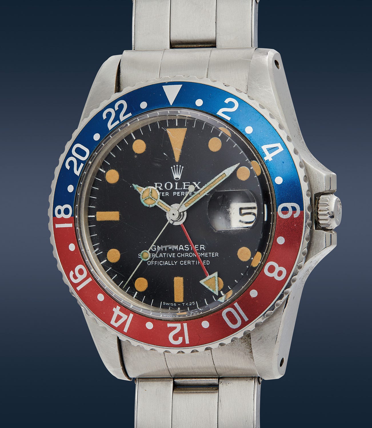 The present example bearing a 2.0 million serial number features the desirable Mark I dial depicted by the long “E” in Rolex and a “string-like” coronet unique to the series. Furthermore, when one views the dial under a loupe, the luminous hour markers display a “waffle-like” texture – a clear characteristic of Mark I dials. From the distinguished “Ride the Wave” collection, this Mark I GMT reference 1675 comes complete with its original punched and numbered guarantee papers, hang tag, and presentation box.
