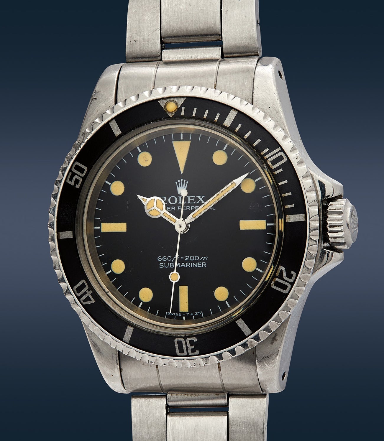 The present lot is dated from circa 1978 bearing a 5.0 million case number and displays a matte black dial with two lines of text. It is fitted with an early 'Maxi 1' dial that are found in early 5 million to early 6 million case serial numbers. This is the last batch of production of matte dial produced by Rolex with “SUBMARINER” written below the depth rating. The present Rolex Submariner reference 5513 “Maxi dial” is preserved in likely unpolished condition, with highly desirable, buttery yellow luminous hour markers that match uniformly with the hands.