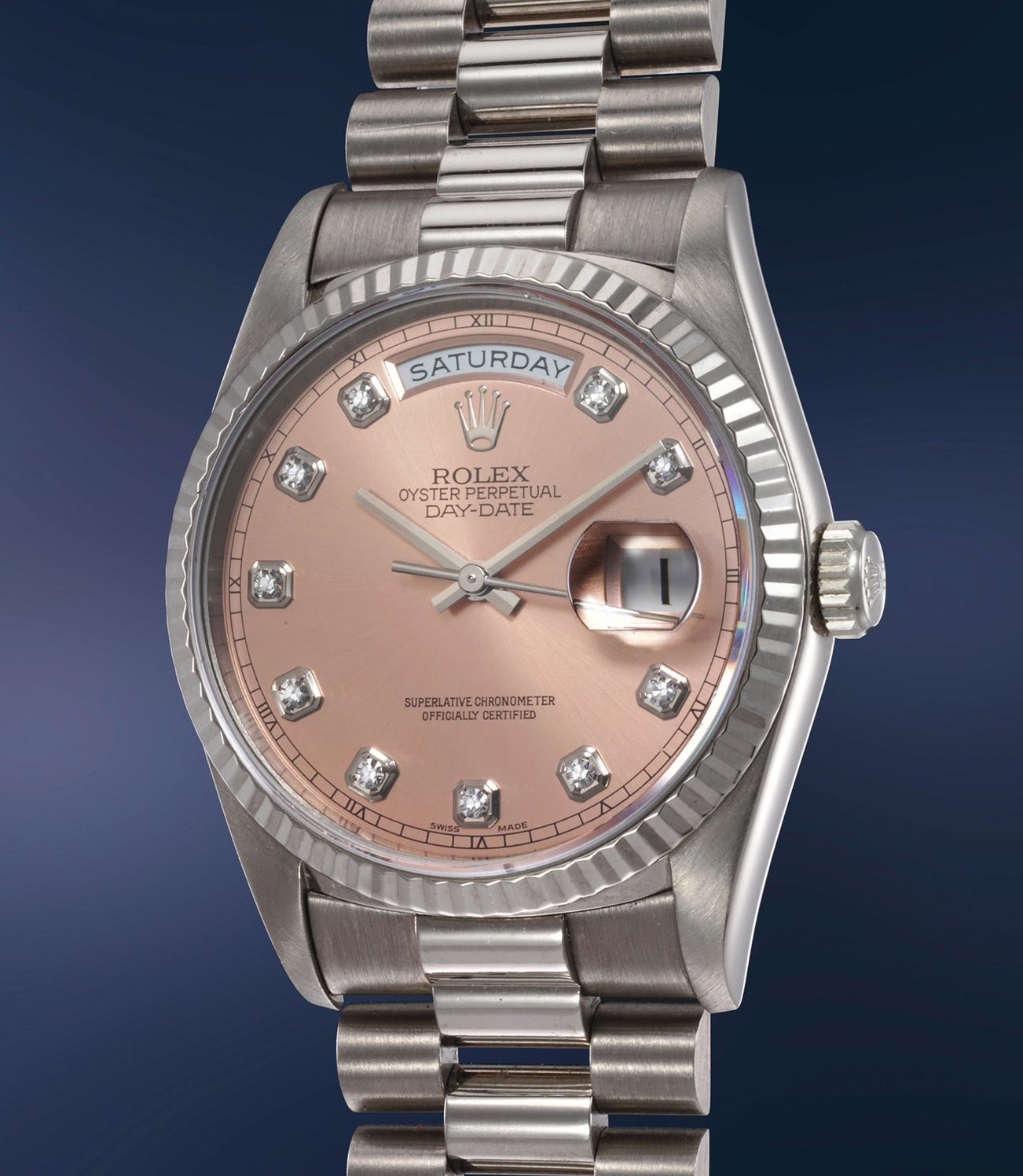 This superb white gold Day-Date is fitted with an incredibly attractive and very rare salmon-colored dial with diamond-set numerals. Preserved in excellent condition, it displays crisp hallmarks under the lugs and sharp finishes throughout.