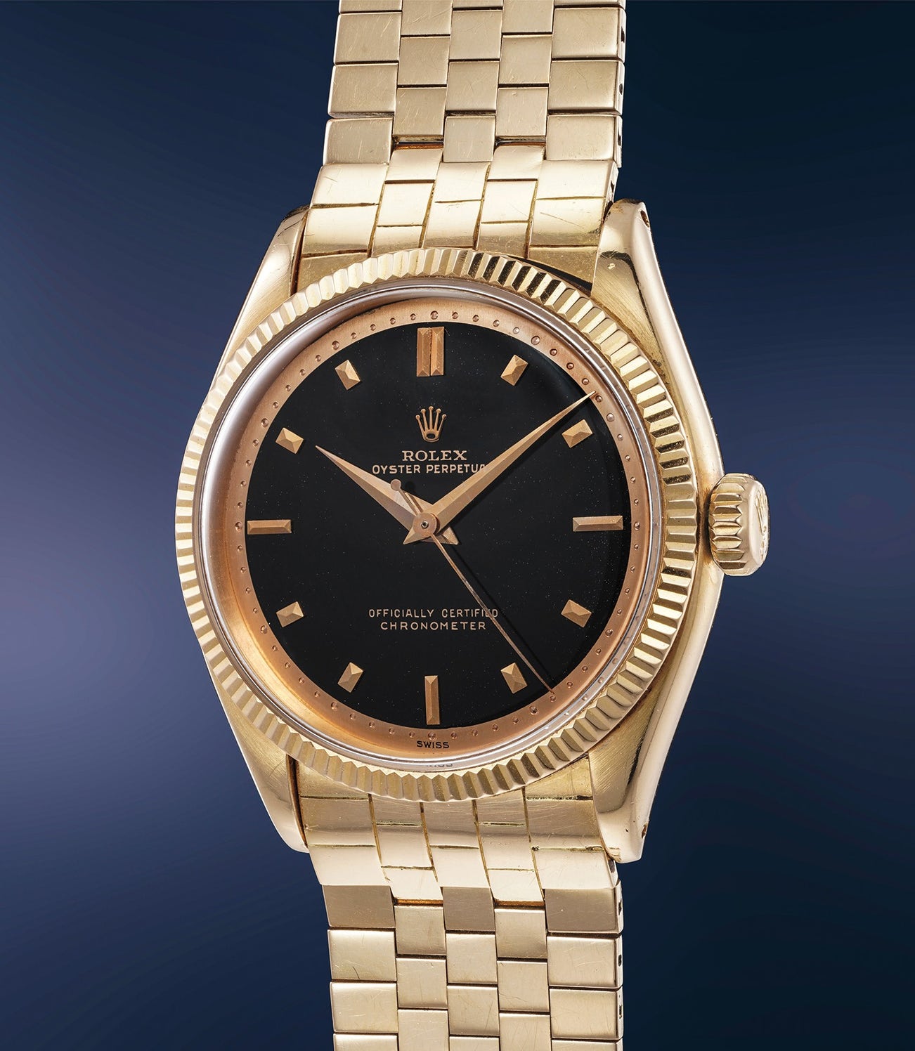 The combination of pink gold case and black dial is very striking and arresting. As an even nicer touch, it's accompanied by a beautiful brick link bracelet stamped for 1955 - an incredibly rarity in its own right.