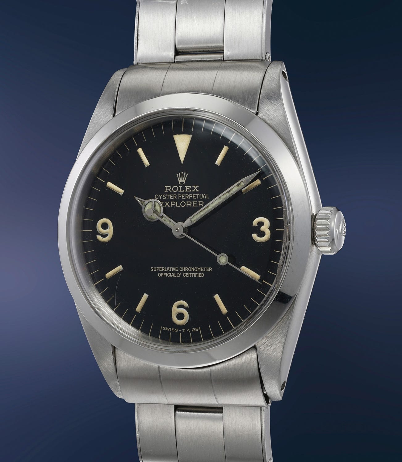 The present example of Rolex Explorer ref. 1016 belongs to one of the last examples fitted with a black “glossy” lacquer dial bearing a 1.5 million serial from the end of 1966 (according to the caseback, the fourth quarter of ’66). The connoisseur will immediately notice the incredible well preserved nature of the dial. Not only the luminous material presents no losses and has developed a subtle, even and charismatic ivory hue, most notably the gloss finish is incredibly well-preserved, without bubbling or flaking as often seen on Rolex dials from this age.