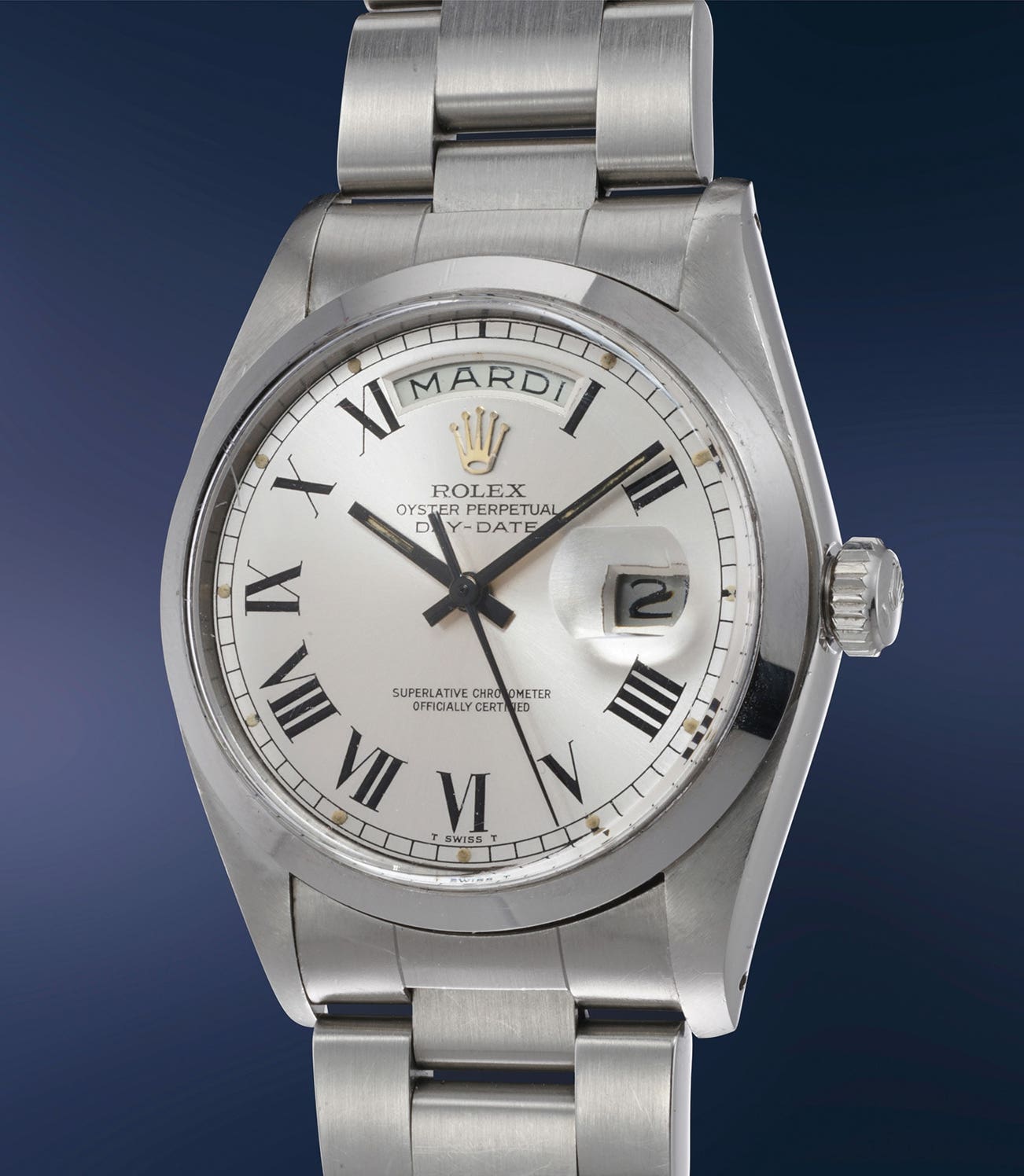As for every rule, however, there are exceptions to every role, including the “no steel Day-Date” one. As it turns out, an absurdly restricted number of prototype/scholar pieces have in fact been made in stainless steel. One example (movement no. 0004547) is portrayed in John Goldberger’s Rolex “bible” 1000 Superlative Rolex Watches. Two more were sold by Phillips in 2018 (no. 0005073) and in 2019 (no. DD411420). This fourth example (no. DD14749), previously unknown to the market, completes the set of the known stainless steel Day-Date. All these four prototype examples (and indeed, as one would expect from a Rolex prototype, they bear no serial nor case number) were originally gifted to Rolex’s watchmakers at the end of their career and they all have the same Roman numerals dial style.