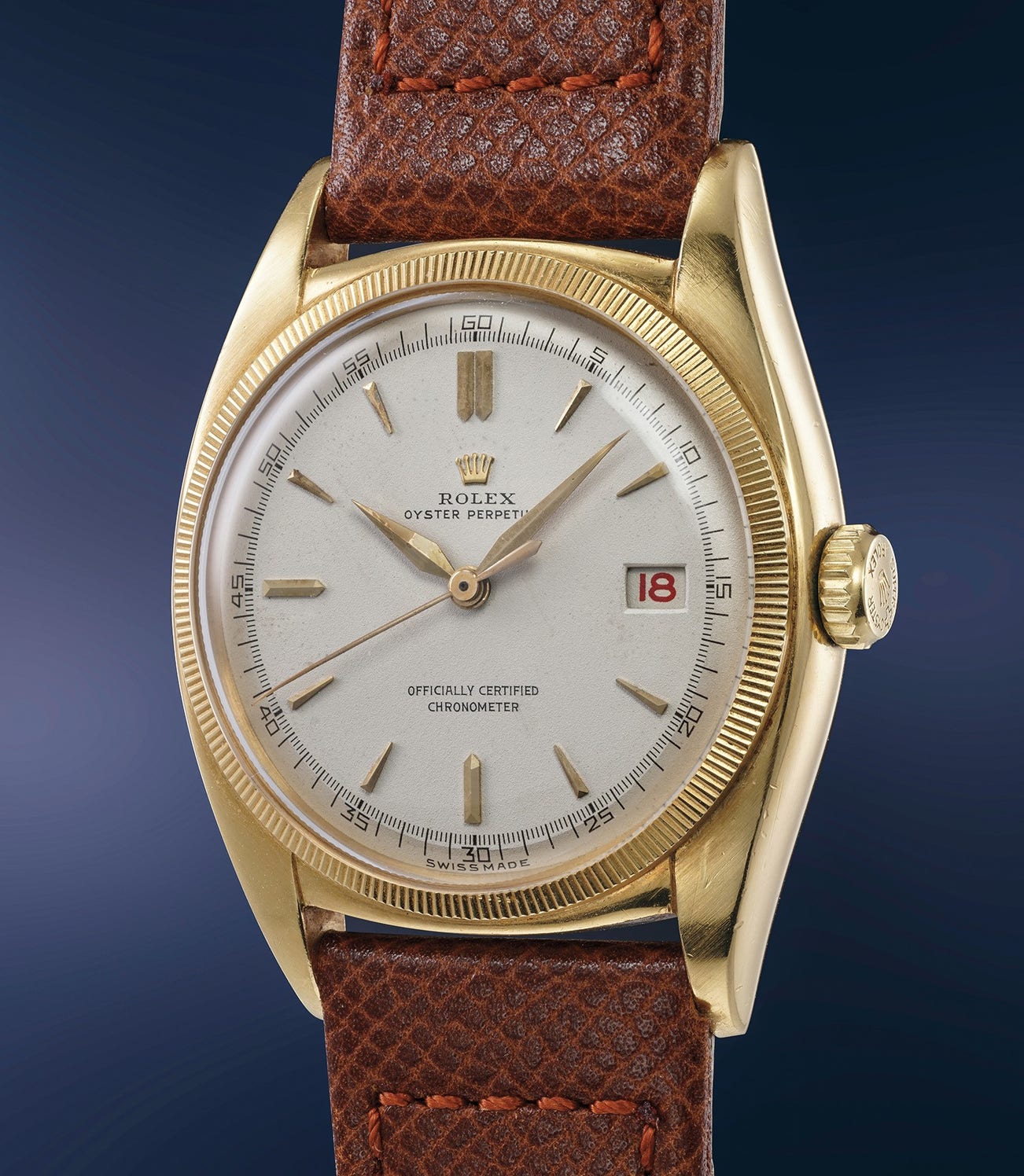 An exceedingly rare and well-preserved yellow gold wristwatch with center seconds and red/black date roulette wheel