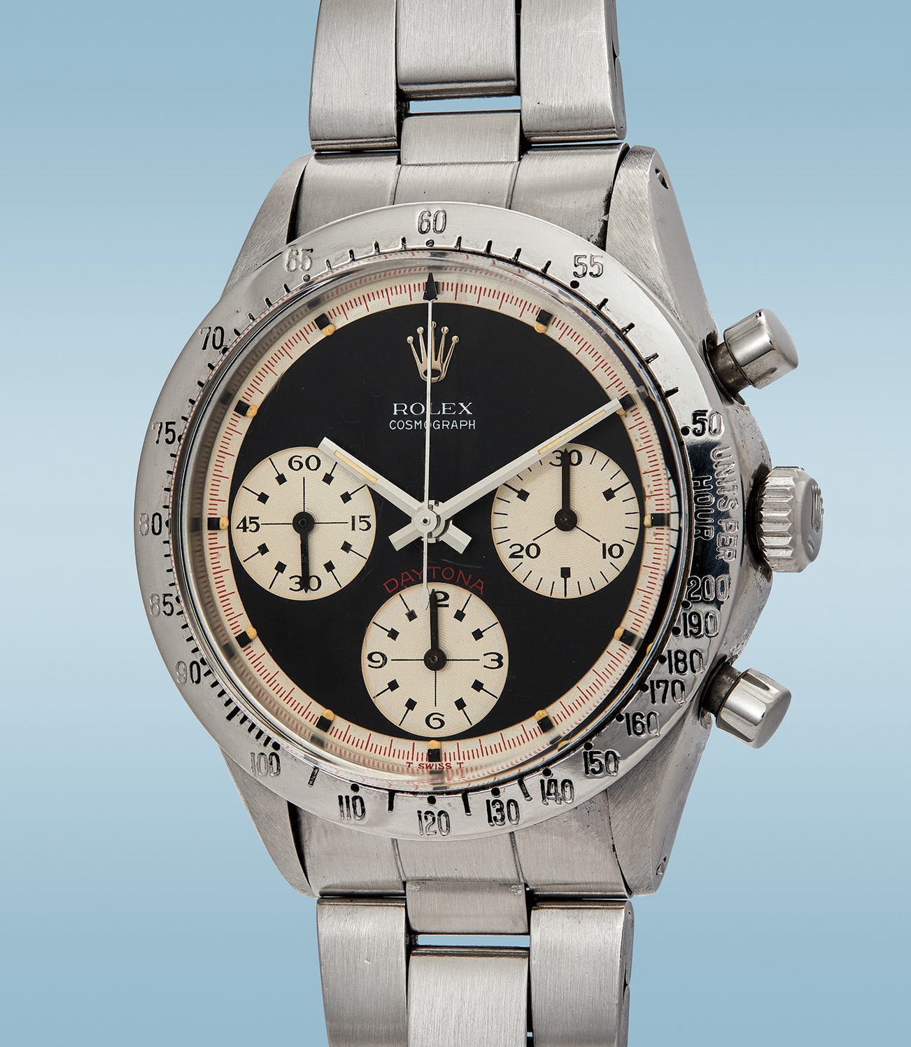 A quintessential “Paul Newman” Daytona, the present example perfectly embodies the watch made famous by the Hollywood legend. It is thanks to this particular dial design that Cosmographs are now synonymous with the famed actor. Featuring a three-dimensional design with Art Deco-style numerals, the black grèné dial with white subsidiary dials, coupled with the bright red of the “Daytona” signature at 6 o’clock, and outer red 1/5th seconds track form a strikingly beautiful aesthetic. When first released, they were under appreciated, however with time the Paul Newman dial configuration became one of the most sought after by collectors, appreciated for its rarity, enduring aesthetics, and celebrated history.