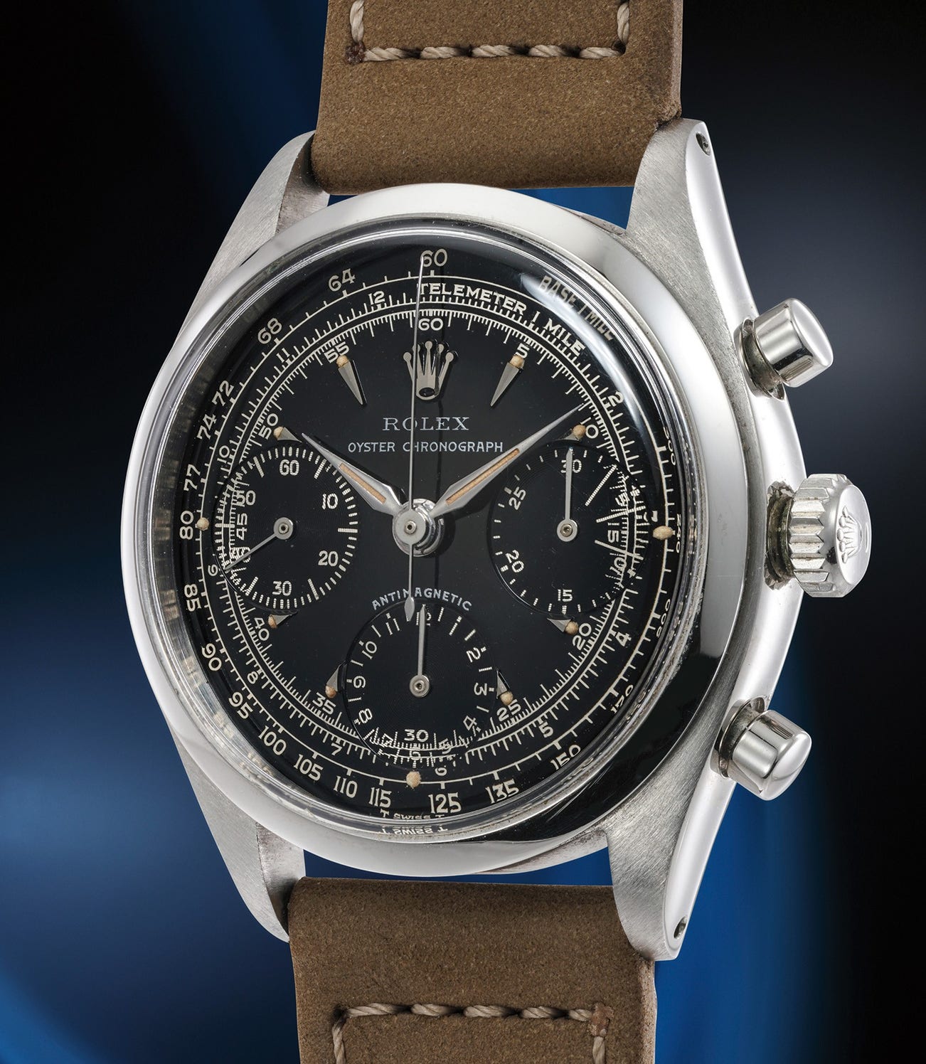 Its dial showcases both telemeter and tachymeter scales along its outer circle. The watch is presented with a finely kept oyster case, showcasing a design that is ever so appealing and eye catching. Examples of any reference 6234 presented in such excellent condition are few and far between. With its extraordinary glossy black dial, the present lot is certainly a trophy for the collector of vintage Rolex sport watches. Most notably, the “T-SWISS-T” found at the lower edge by 6 o’clock indicates that Tritium was used for the luminous hands and hour markers, which is correct as the serial number 1’262’289 dates the watch to 1965, when tritium was used exclusively for the luminous material used on all Swiss watches.