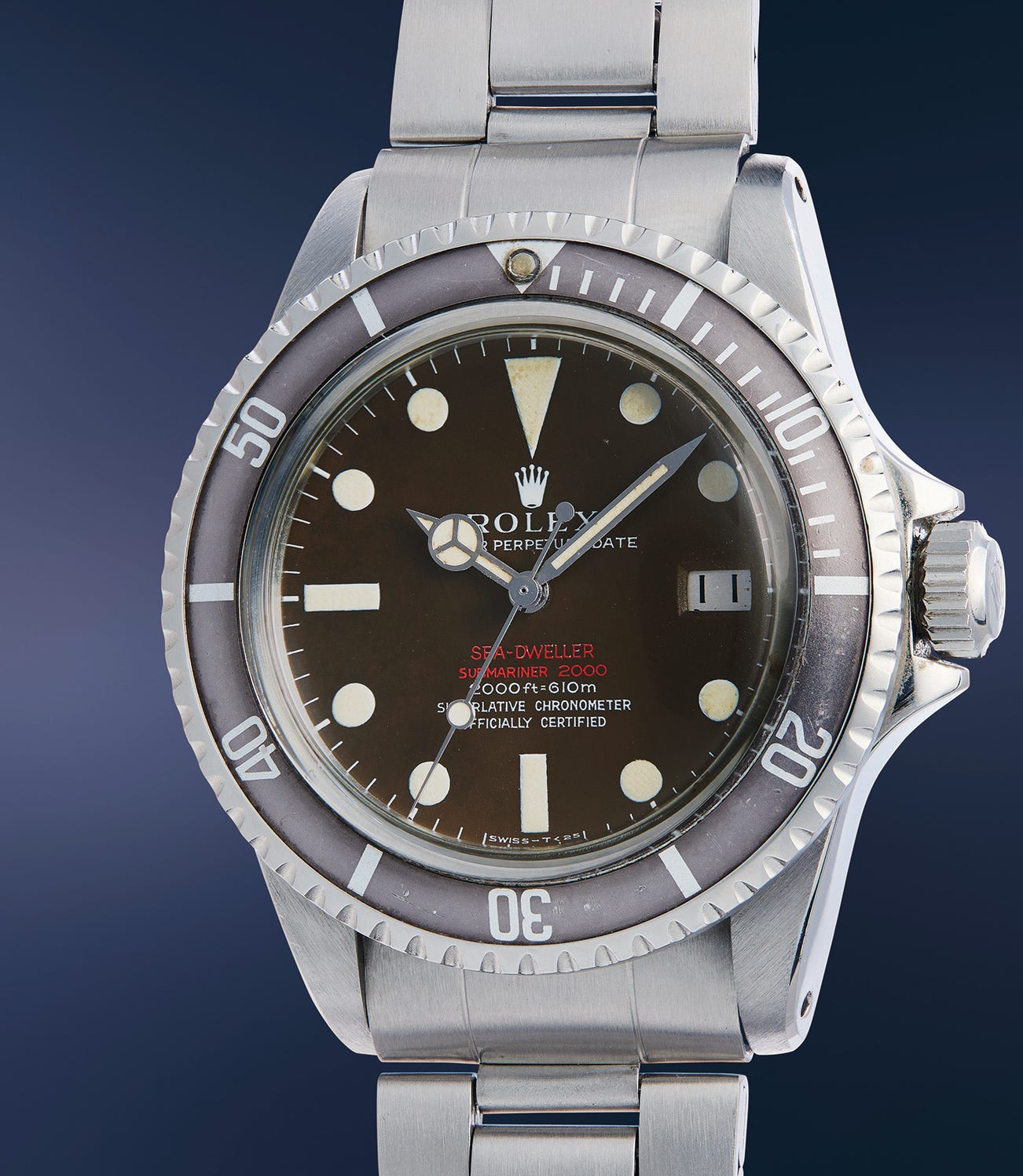 The present Rolex Sea-Dweller, bearing the serial number 1’759’664 is fitted with a Mark II variant of the “Double red Sea-Dweller” dial with a small oval at the base of the coronet and the “D” in “Dweller” aligned with the “I” in “Submariner”. It is stunning with the luminous hour markers aging to a chocolate hue. The case is well-preserved and overall, a very pleasing example of these highly desirable models.