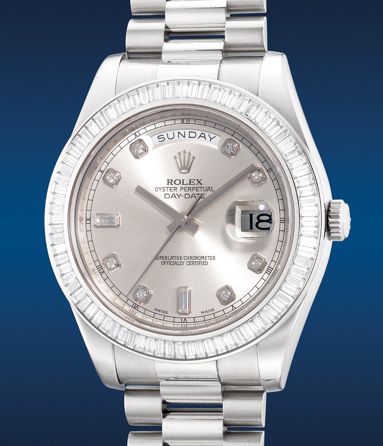 The present example Rolex Day-Date II ref. 218399BR is not just an ordinary example but one adorned with diamond-set indexes and a sublime baguette-cut diamond-set bezel that compliments the silver sunburst dial alongside its white gold case. Packed with more than just a presence on the wrist, gem-set Day-Date’s have become more sought after by collectors in recent times, due to its wide array of selections and its timeless design. Complete with its full set of accessories, the present timepiece is further well-preserved adding on to its desirability.