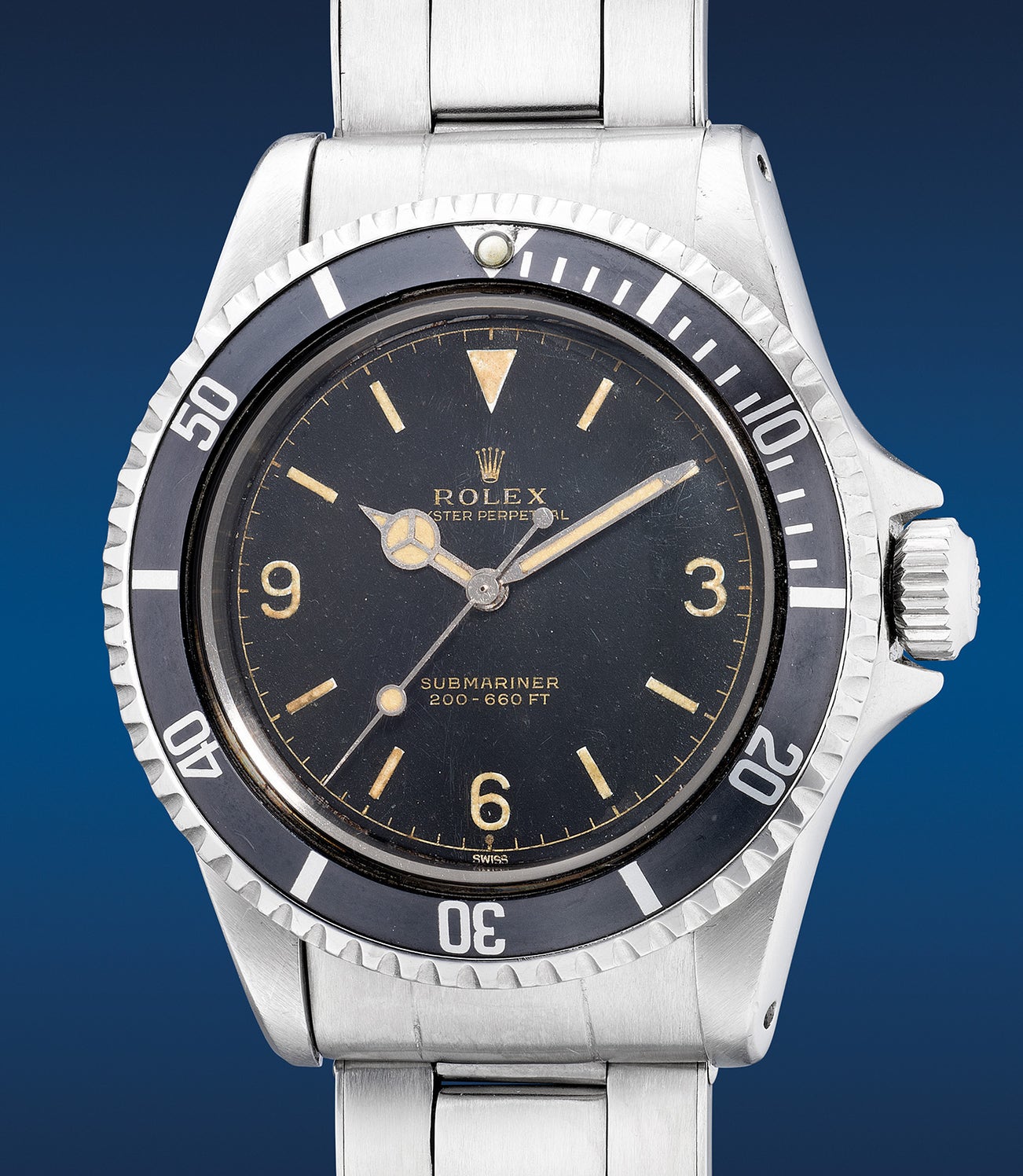 The present Submariner Explorer dial ref. 5112 is undoubtedly part of the earliest production recognizable by its exceptional details such as the attractive two-liner gilt dial with chapter ring and pointed crown guards. Furthermore, the depth rating differs from later dials with the absence of “m” for 200 meters, as well as a capitalized, non-italic “FT” inscription for feet. Marked with the most desirable and important detail of all is the dot that sits at 6 o’clock which identified by collectors as the “Examination mark” dial. Such dials were in production only for a very short period between 1961 until 1962 to designate the transition of luminous material (tritium over radium) with lower radiation count due to health hazards during the era.