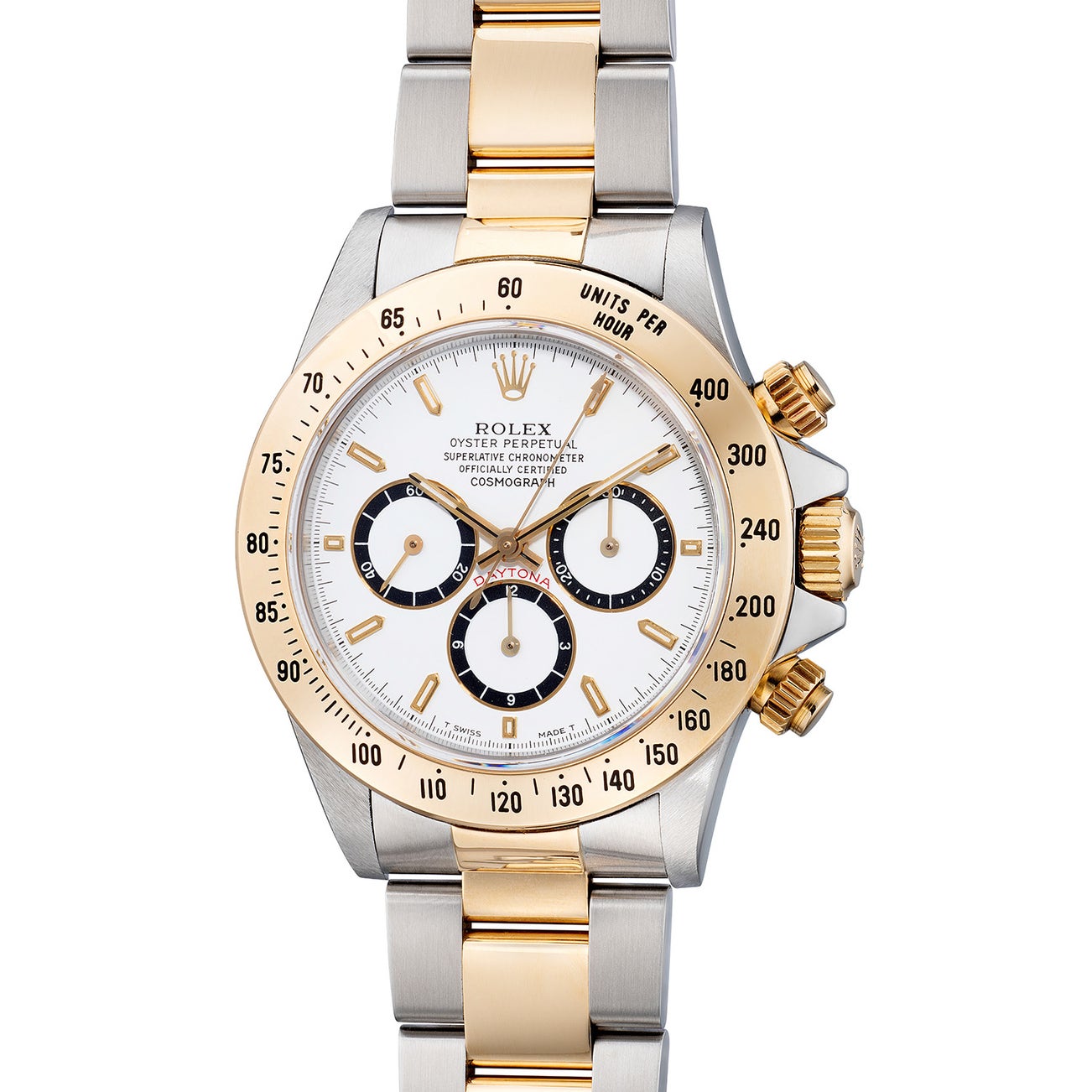 The present two-tone Cosmograph Daytona ref. 16523 fitted with a white dial bears an N serial from 1992, furthermore the dial features correct characteristics of early dials including the inverted 6 in the subdial at 6 o'clock with "T SWISS MADE T" underneath, and "OFFICIALLY CERTIFIED" at 12 o'clock. Offered with its original guarantee and accompanied with its full set of accessories, the present example is preserved in excellent overall condition and is a great opportunity for chronograph lovers seeking for a discontinued model.