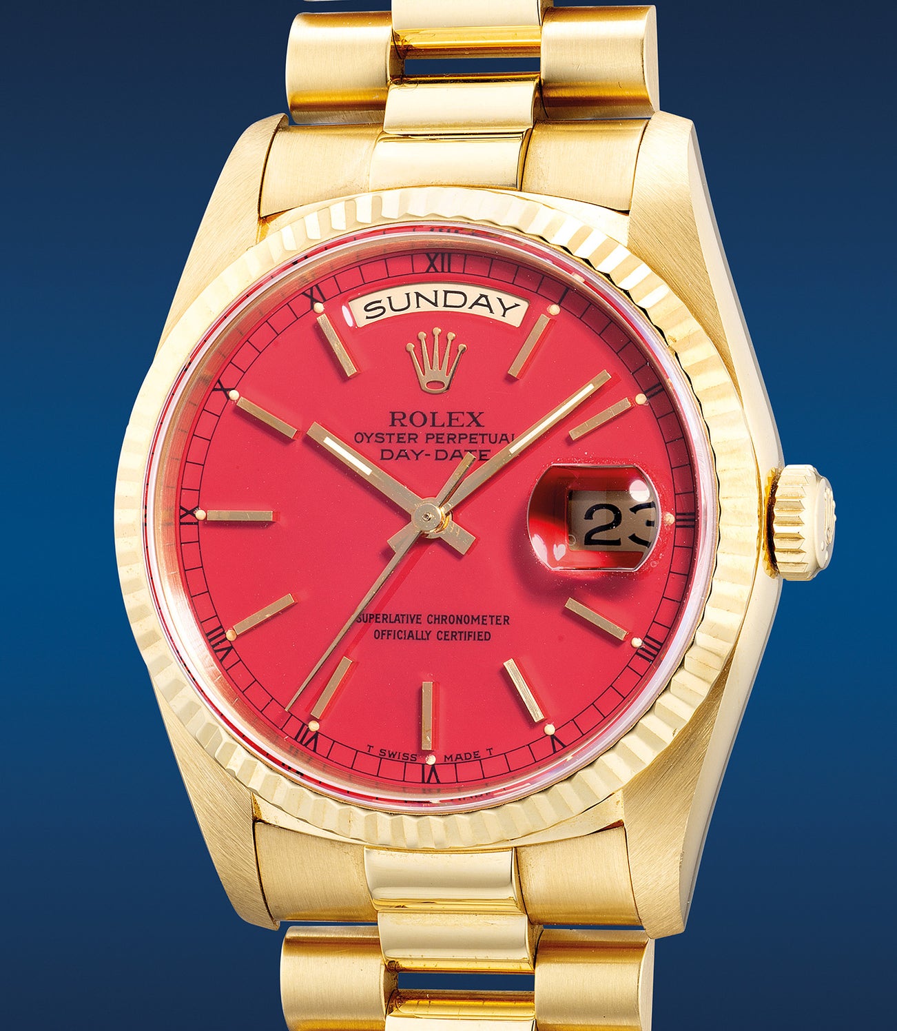 The ref. 18238 was introduced in 1988 with an upgraded cal. 3155 featuring a double quick-set function for the day and date enhancing its practicality by a mile. With aesthetics similar to its forefather, the reference was available with various dials. Boasting an exhilarating contrast between the yellow gold case against the vigorous glossy red Stella dial, the case is preserved in absolutely exceptional condition, ticking all the box with sharp edges, strong lugs and crisp hallmarks. But that is not all, the present example also comes with its original guarantee, and full set of accessories. Illustrated in the Day-Date: The Presidential Rolex published by Pucci Papaleo, a similar configuration of the ref. 18238 fitted with a red Stella dial cased yellow gold bears a L879’576 serial was sold in Italy during 1990. The present example with immense resemblance bears a slightly earlier L879’101 serial from circa 1989 not only wows with a flawless dial with Roman minute track, the condition of the timepiece is no doubt an exciting example. Impressive all around, this red Stella Day-date is surely a collector’s gem.