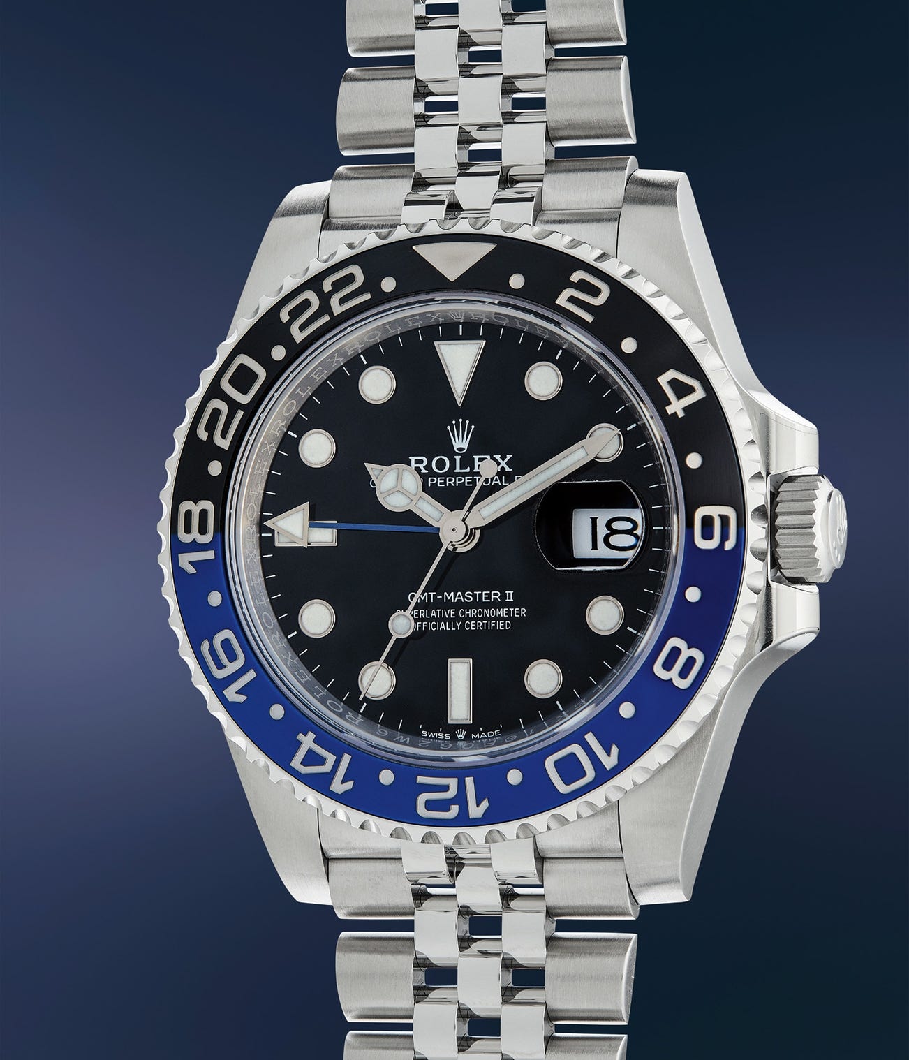 The reference 116710BLNR was first presented during Baselworld 2013 and received immediate praise by both critics and collectors. Nicknamed the “Batman” for its obvious bicolour black and blue bezel. It was updated in 2019 with the present reference 126710BLNR, fitted with an updated calibre (3285) introduced the previous year, but now available also with a Jubilee bracelet - a nod to historic GMT-Master models, which were offered with a choice of Jubilee or Oyster bracelets. The collecting community immediately bestowed a new nickname for the Jubilee bracelet variation of the BLNR version: the “Batgirl”, as opposed to the “Batman” for the Oyster bracelet version, most likely for the more suave feeling of the 5-link bracelet.