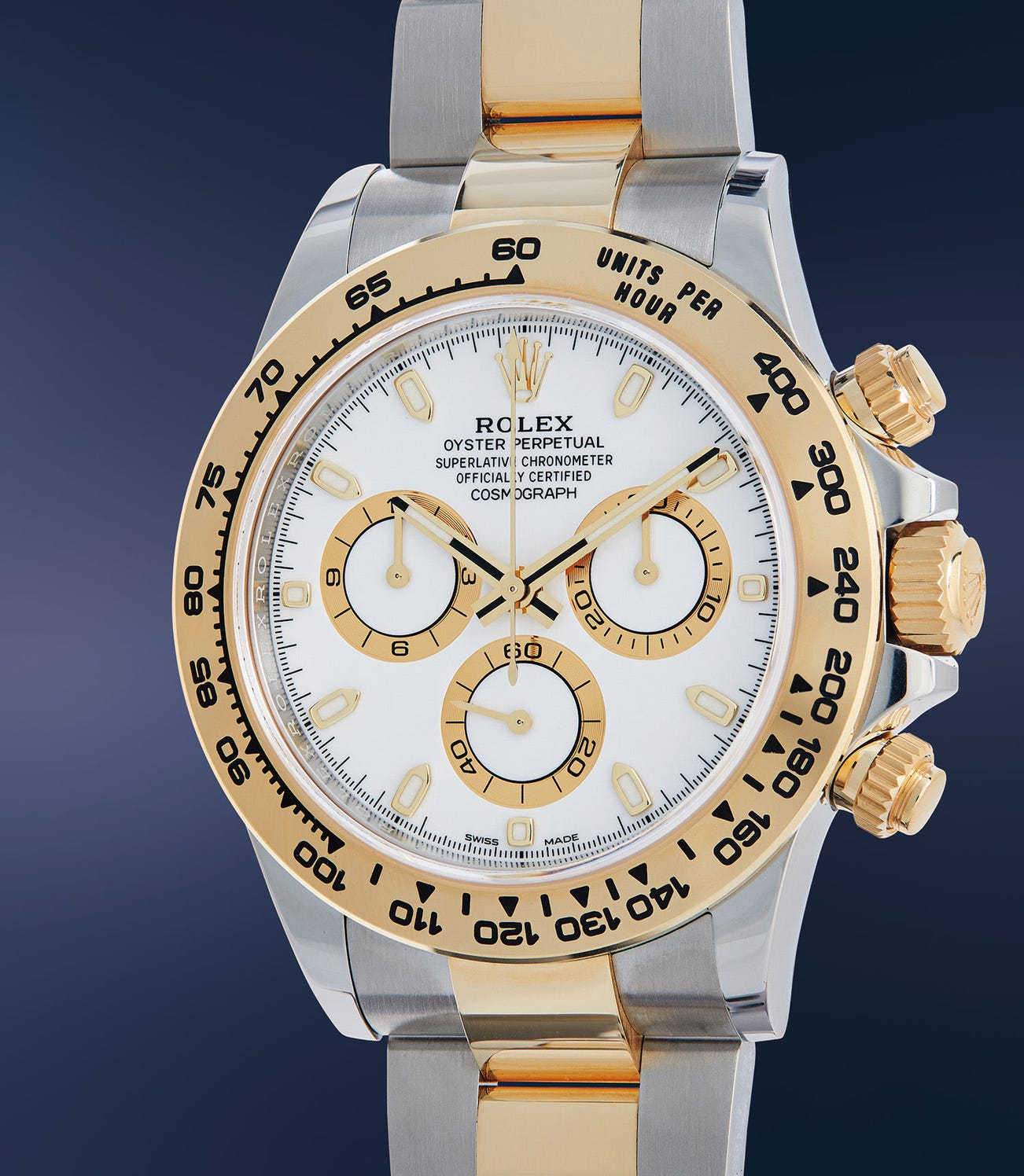 At first, one may see this reference 116503, in Rolex’s proprietary yellow gold alloy and stainless steel, as just your typical modern two-tone Cosmograph Daytona. Fitted with a white dial, it is an elegant moderator between day-to-day utility and chic statement piece. Furthermore, this example is as new, purchased on the last days of 2021, and offered with all its original accessories.