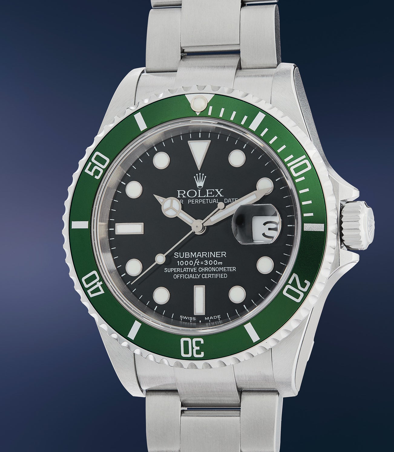 The earliest versions of the “Kermit”, like the present wristwatch, became known as the “Flat 4” due to the fat top found on the “40” numeral of the bezel. Research suggests production numbers were limited and therefore these early wristwatches have become highly sought after. At Baselworld 2010, Rolex released the reference 116610LV, the new generation green bezel Submariner, affectionately known as the “Hulk”, named after the Marvel character. This model featured a more robust case with broader lugs, a green soleil dial versus the black dial of the 16610LV, and a new green Cerachrom ceramic bezel.