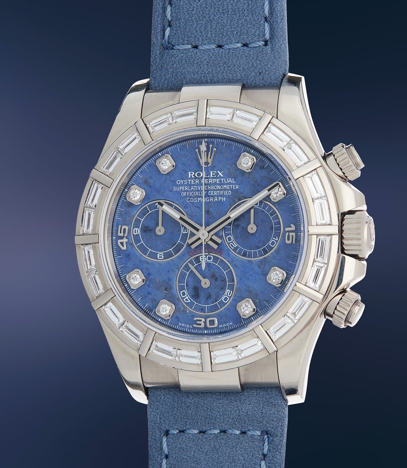 The present pairing of a sodalite dial appointed with diamond hour markers, and a factory baguette diamond bezel, is further accentuated by a perfectly preserved, unpolished case still retaining its caseback sticker. The present Daytona accomplishes extravagance with charm and aplomb - a rare Rolex jewel for its next owner.