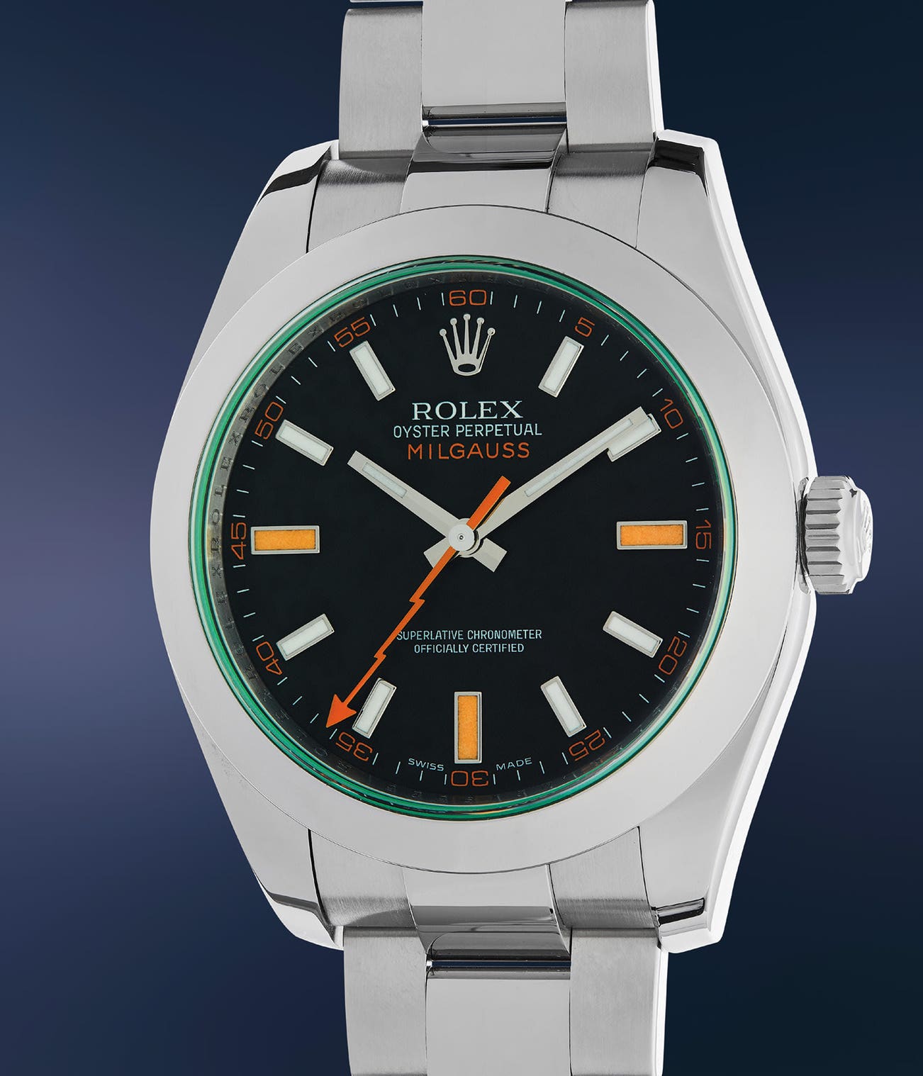 After nearly 20 years since the discontinuation of reference 1019, Rolex released a new Milgauss model in 2007, the present ref. 116400GV. Its most striking characteristic is without a doubt the orange “Thunderbolt” second hand, an homage to the vintage model ref. 6541. Also noteworthy is the fact that the present model is the only Rolex reference to feature a tinted crystal. The overall aesthetic of the piece is extremely bold, the orange of the hand reprised by the five minute Arabic divisions, Milgauss designation, and orange-tinted luminova for the 3, 6 and 9 hour markers.