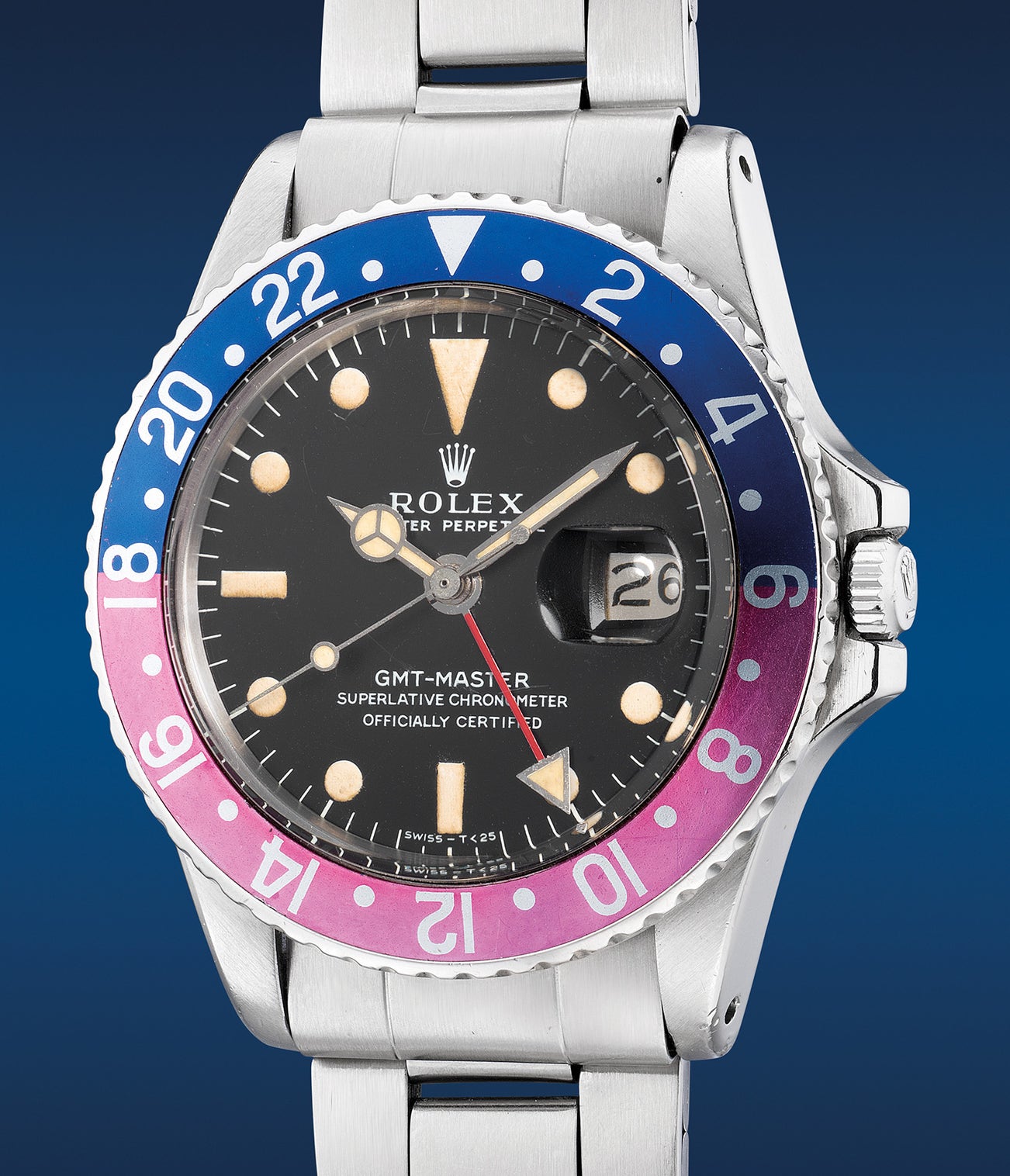 A fine and attractive stainless steel dual-time wristwatch with center seconds, date, MK I dial, fuchsia bezel and bracelet