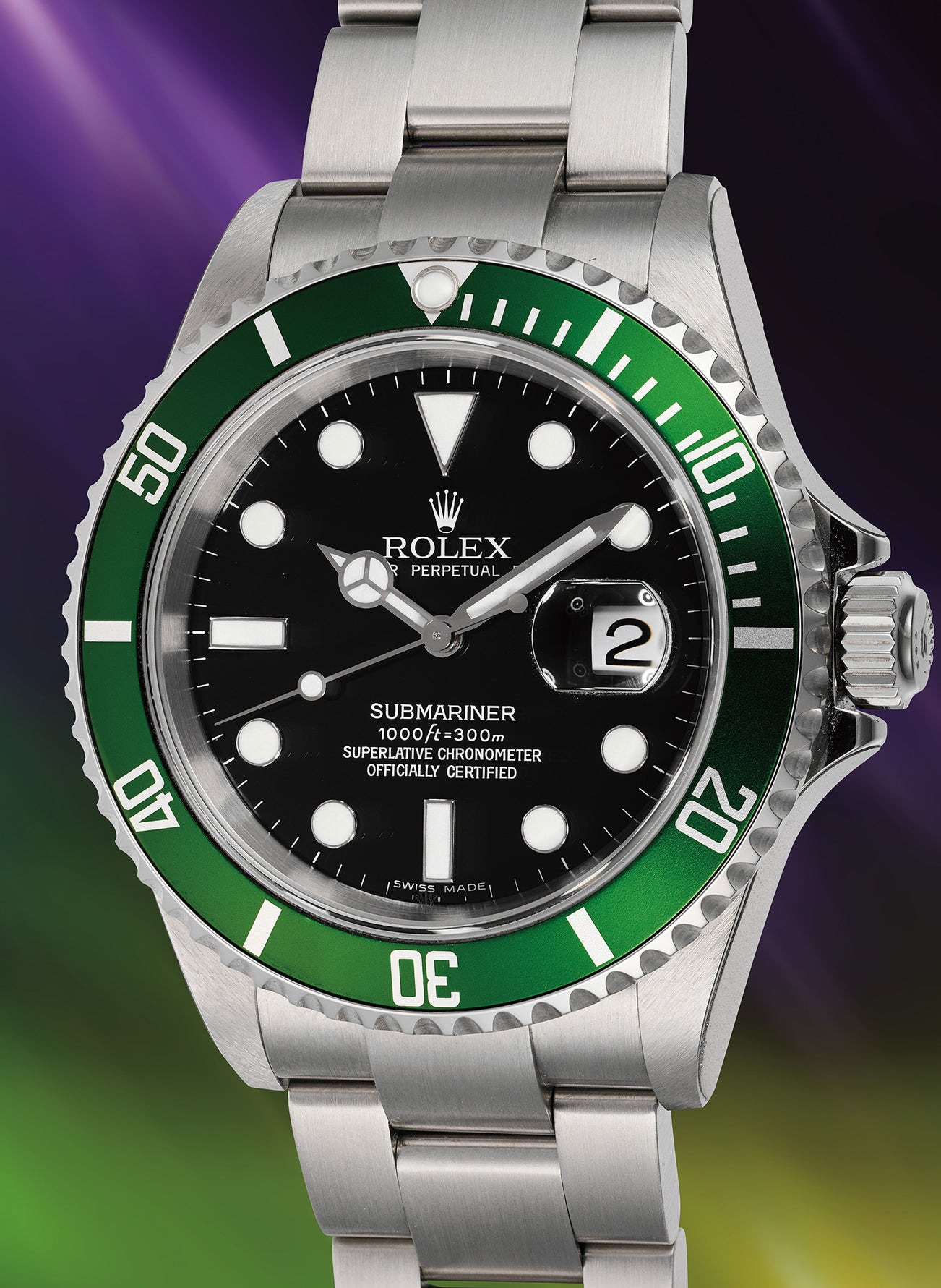 The present specimen bearing a "D" serial is from 2005, and the reference was discontinued in 2008. An evergreen design, Rolex relaunched the reference 122610LV in 2020 with design aesthetics that remains faithful to the original “Kermit”, but with a larger 41mm case size and an upgraded Cerachrom bezel insert for longevity.