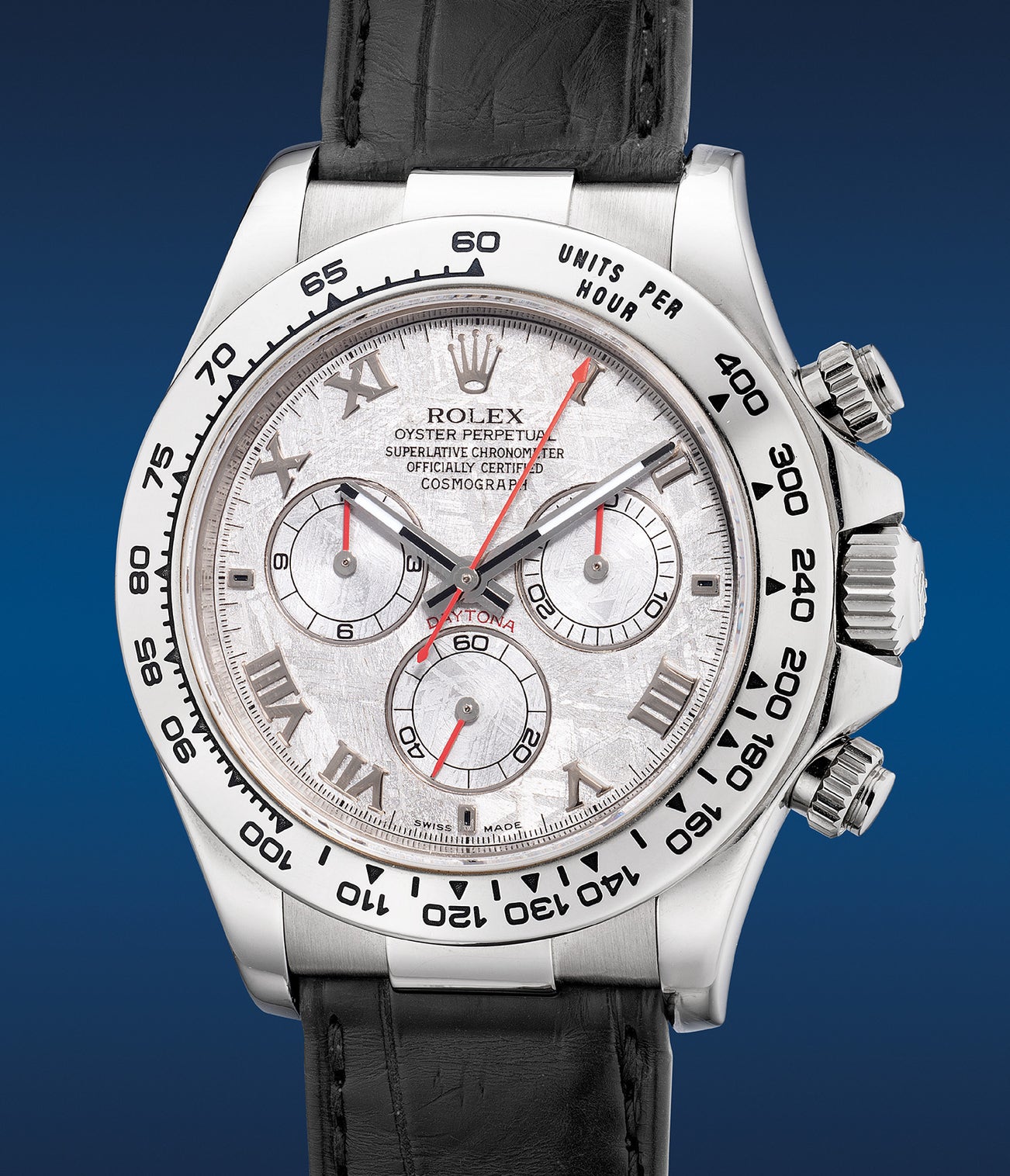 The present example Rolex Daytona ref. 116519 with a meteorite dial from circa 2015 is offered with its original guarantee and presentation box. With the supply of meteorite at an all time low, collectors have increased their appetite for wristwatches featuring the rare dial. A perfect opportunity to acquire one now.