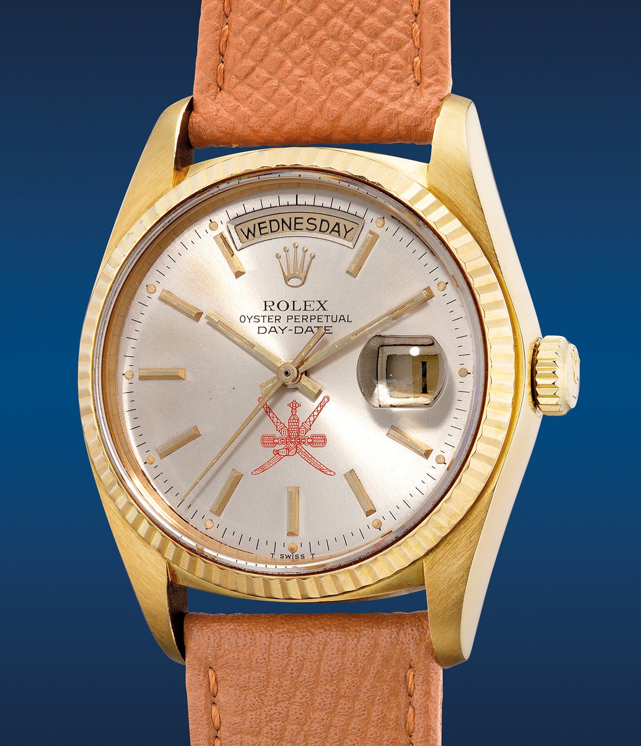 The present Rolex Day-Date ref. 18038 features a rare and desirable red Khanjar dial from circa 1978 being one of the first examples of the reference produced right after its launch. Timepieces with the Khanjar emblem on the dial were made specially for the Sultanate of Oman as gifts to loyal servants, dignitaries and friends of the Sultan.