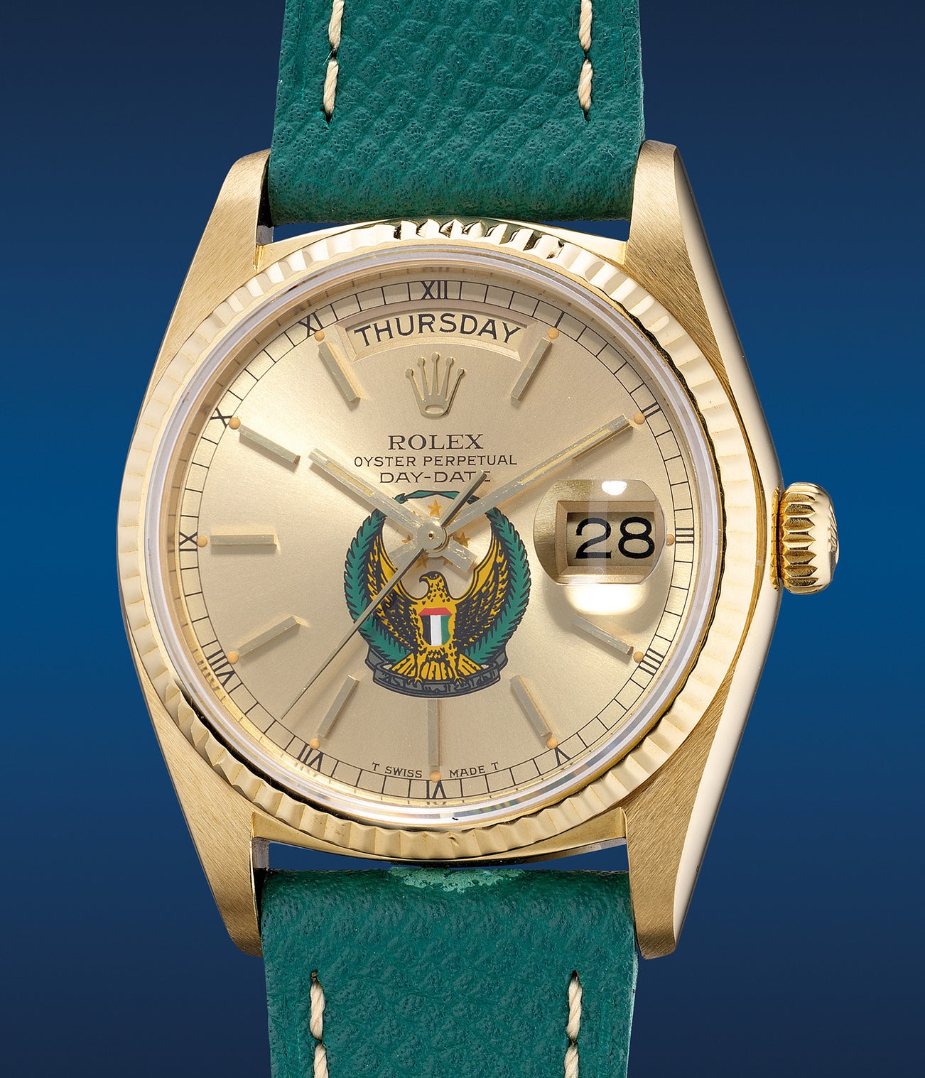The ref. 18038 was released by Rolex in 1977 and featured a new caliber 3055. Essentially bearing similar aesthetics to its ancestral models, it featured a practical single quickset mechanism for adjusting the date. Dressed in 18K yellow gold with a dial to match it, the present example belongs to a small batch of the reference made exclusively for the U.A.E. Armed Forces stamped with its emblem on the dial.