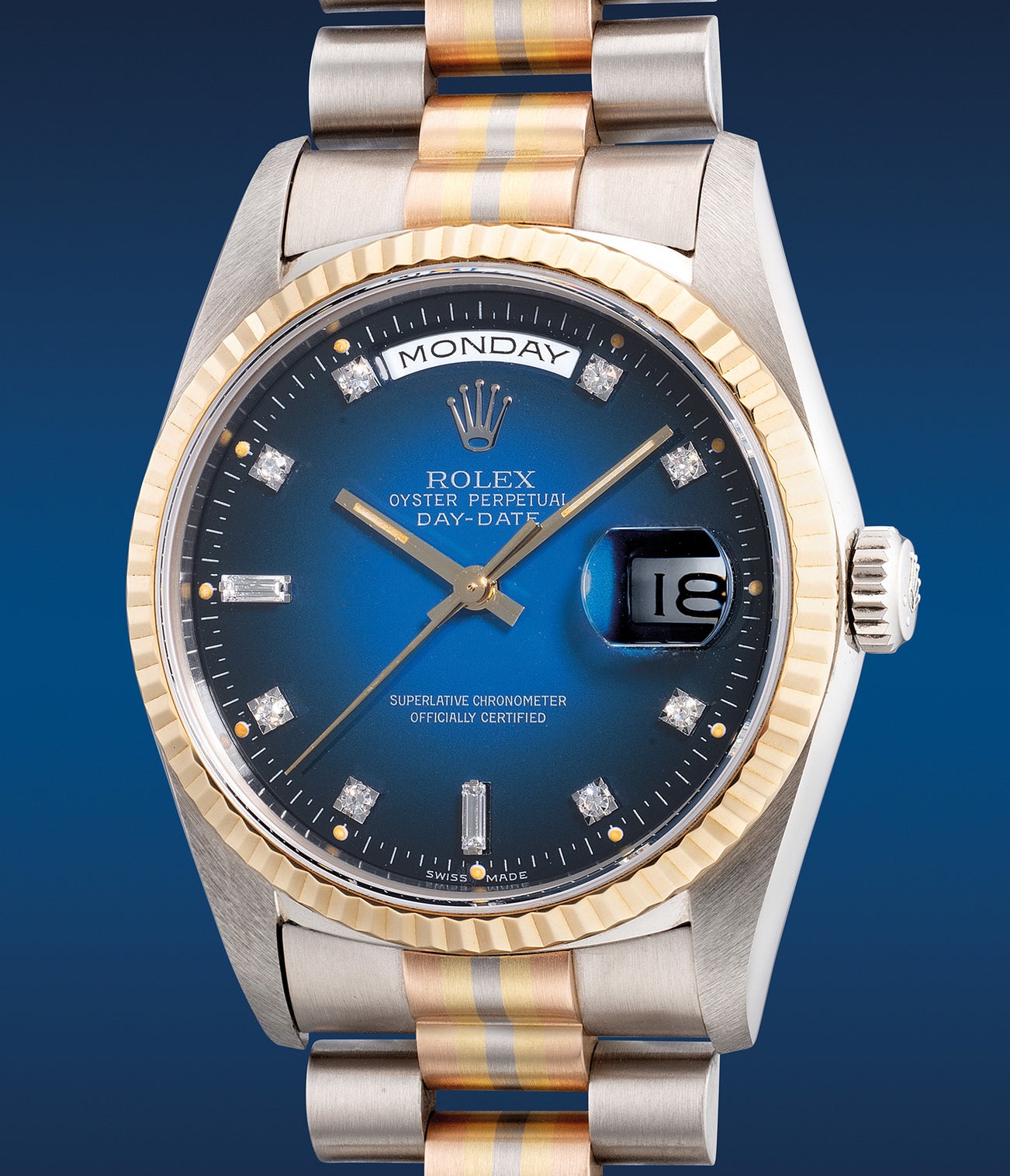 A fine and attractive two-tone yellow gold and white gold wristwatch with center seconds, day, date, blue “fumé” dial, diamond-set indexes, three-colour gold bracelet and presentation box