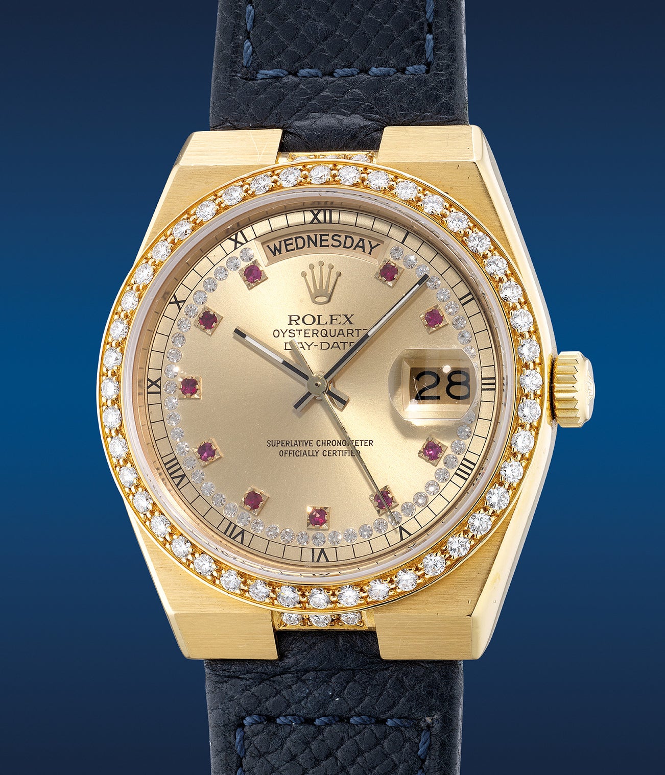 The present Rolex Oysterquartz Day-Date ref. 19048 from circa 1983 features an extravagant expression of luxury, fitted with a matching gold dial, the outertrack is bedazzled with diamonds, wrapping the ruby-set hour markers in stunning contrast. Furthermore the bezel and case is also finished with diamond-set decoration. Offered in excellent overall condition this rare example will surely please the passionate community of vintage Rolex Day-Date collectors.
