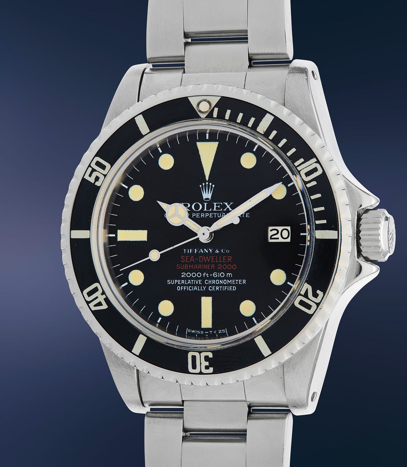 This Double Red Sea-Dweller is in outstanding condition with a sharp, well-preserved case, and stunning dial with the luminous hour markers and hands beautifully aged to a light yellowish hue. Acquired by the consignor at auction in 2004 and cherished in his collection until now, this is a rare opportunity to own one of these treasured “Double Red” Sea-Dweller models, and all the rarer due to the Tiffany & Co. signature.