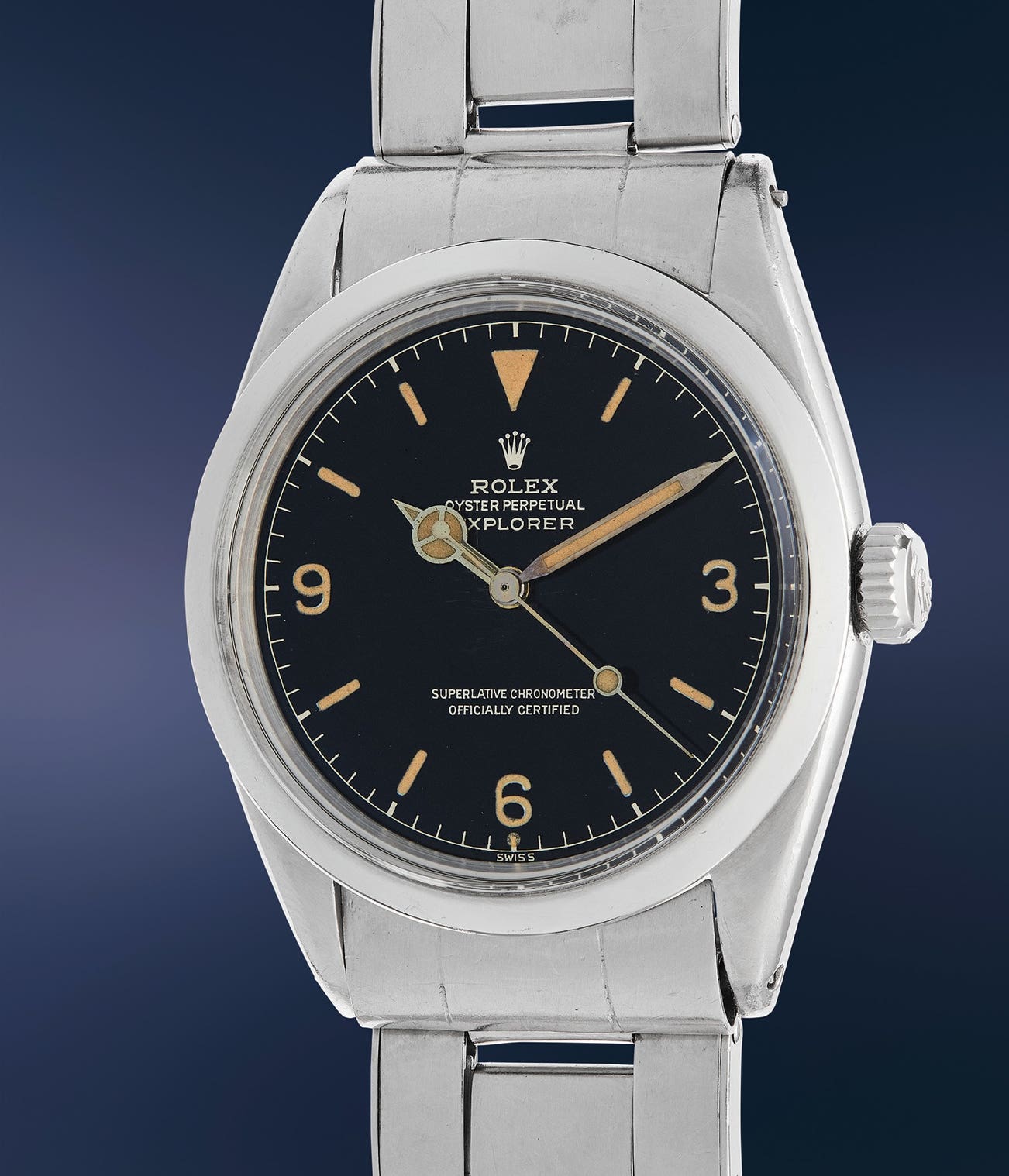 Rolex continued to evolve the design, and in the early 1960s introduced the reference 1016 with an upgraded movement, the caliber 1570, incorporating a hacking feature. This lovely reference 1016 from 1962 features its original and unrestored galvanic black dial retaining its wonderful glossy surface and gilt print. The luminous indexes have aged to a pleasing light brown hue, giving it an unmistakable vintage character. Combined with its well-preserved case and riveted Oyster bracelet, this watch is a highly collectible and attractive variant of the iconic Explorer that is sure to please.