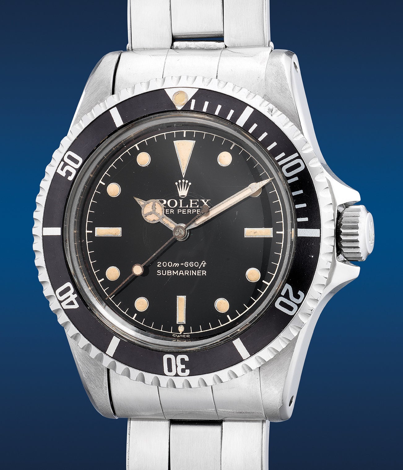 The various iterations of crown guards have developed their own nicknames and followings as the design evolved. The earliest were square-shaped, of which it is estimated very few exist. It is speculated that criticism of the bulky square crown guard prompted Rolex to modify the cases they had in stock, giving raise to the “eagle beak” crown guard. Finally, Rolex produced cases with unobtrusive pointed crown guards (sometimes abbreviated by collectors as PCG), as found on the present example. These early Submariners were fitted with stunning black glossy dials and featured either two or four lines of text at 6 o’clock with gilt printing in either silver or gold (or both). By the late-1960s, the crown guards were changed to a rounder design that is still in use today.