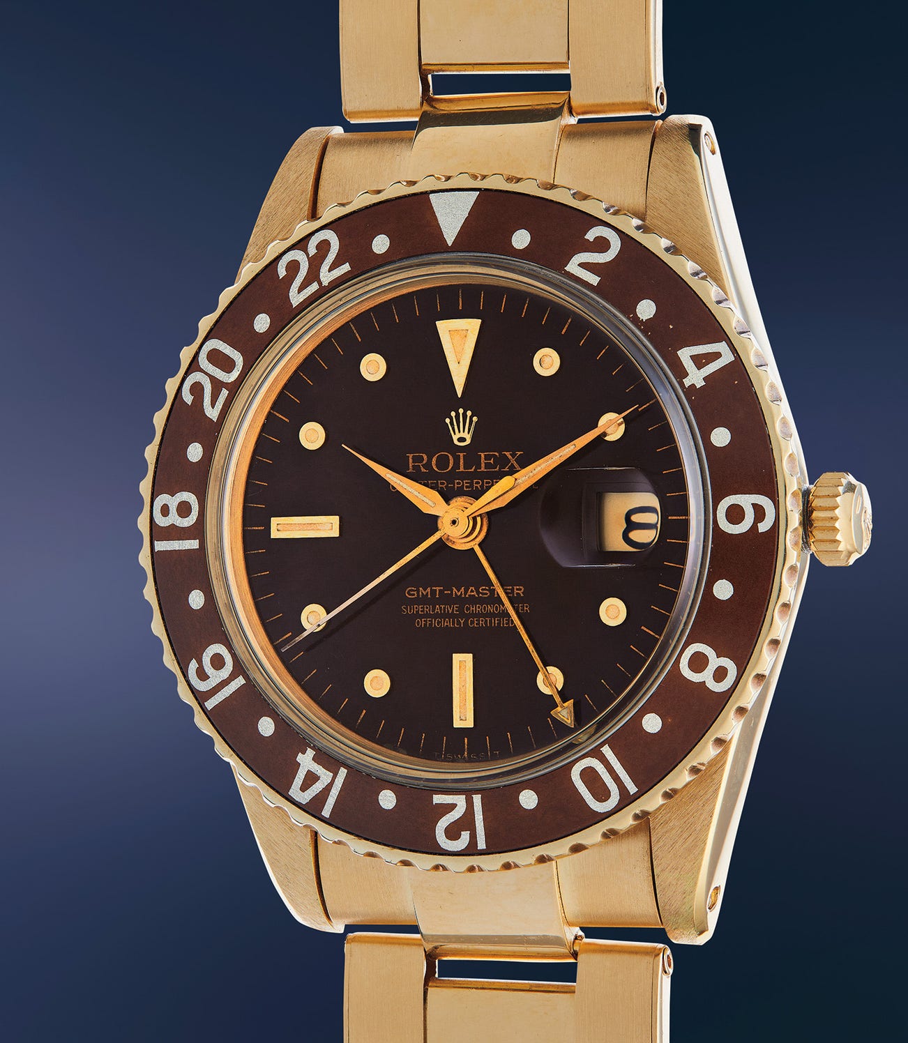 This early and extremely attractive yellow gold GMT-Master is a rare transitional model, featuring rare and early luminous leaf hands. The watch’s attractiveness is further enhanced by its vibrant grené dial with gold cup-shaped luminous hour markers referred to by collectors as “bicchierini”. A highly sought-after watch with a remarkable story behind it, the present GMT-Master is a handsome example that will certainly delight its next owner.