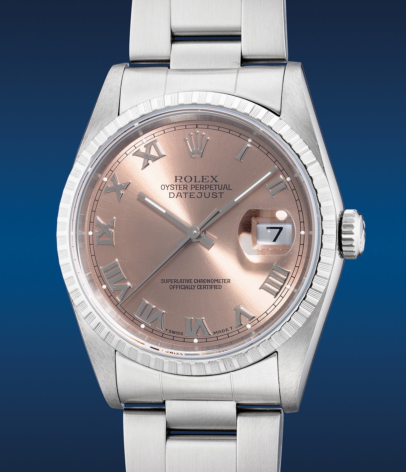 A fine and attractive stainless steel wristwatch with center seconds, date, "salmon" sunburst dial, Roman numerals, bracelet, guarantee and presentation box