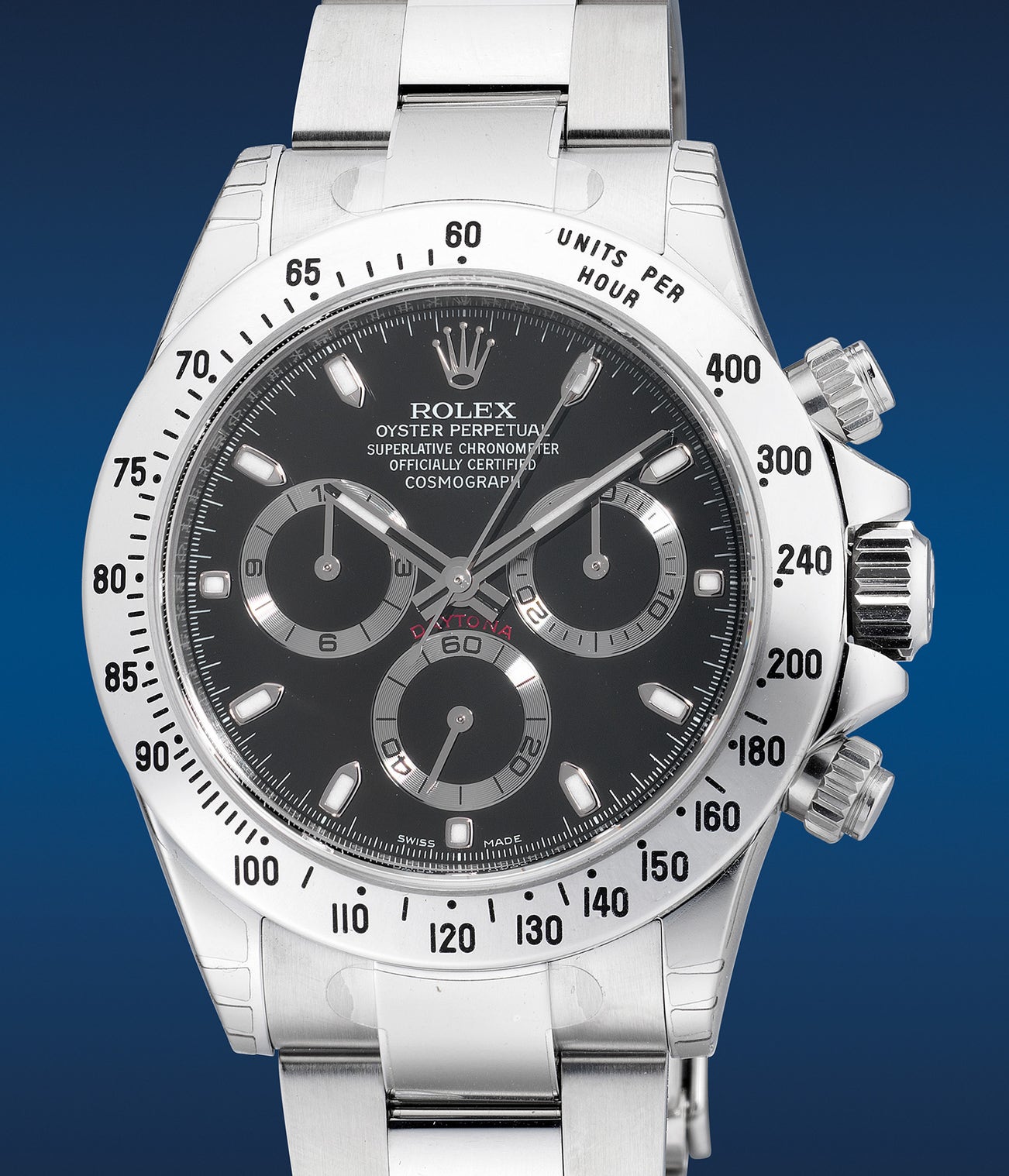 The present example Rolex Cosmograph Daytona ref. 116520 with a black from circa 2016 is offered in “new-old-stock” condition with its factory stickers fully intact. One of the hottest sports references by Rolex today, the timeless appeal and robustness makes it a fan favourite. Complete with its full set of accessories, it is a great chance for collectors to acquire this unworn example now.
