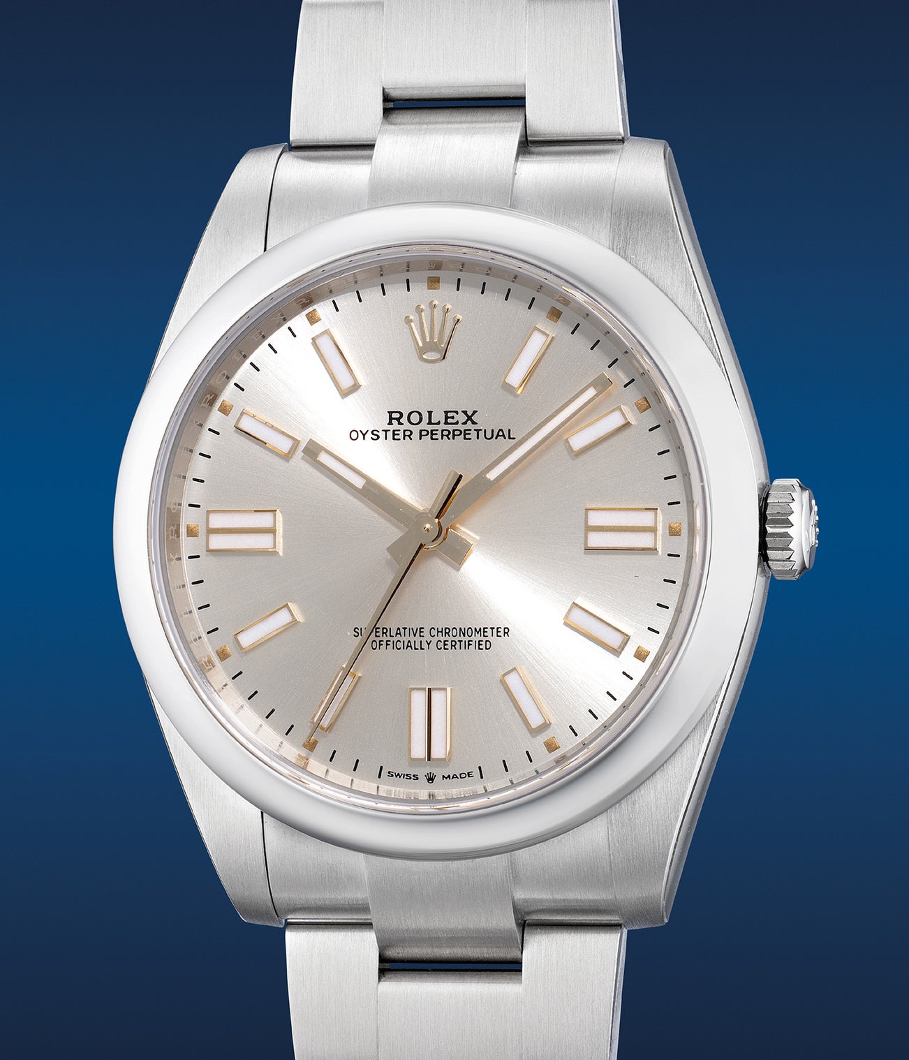 The present example Rolex Oyster Perpetual 41 ref. 123400 features a silver sunburst dial from circa 2021, that is offered in unworn “like new” overall condition and complete with its full set of accessories. For those who may think that the lacquer coloured examples are a little to flashy, this clean example is a wise choice.
