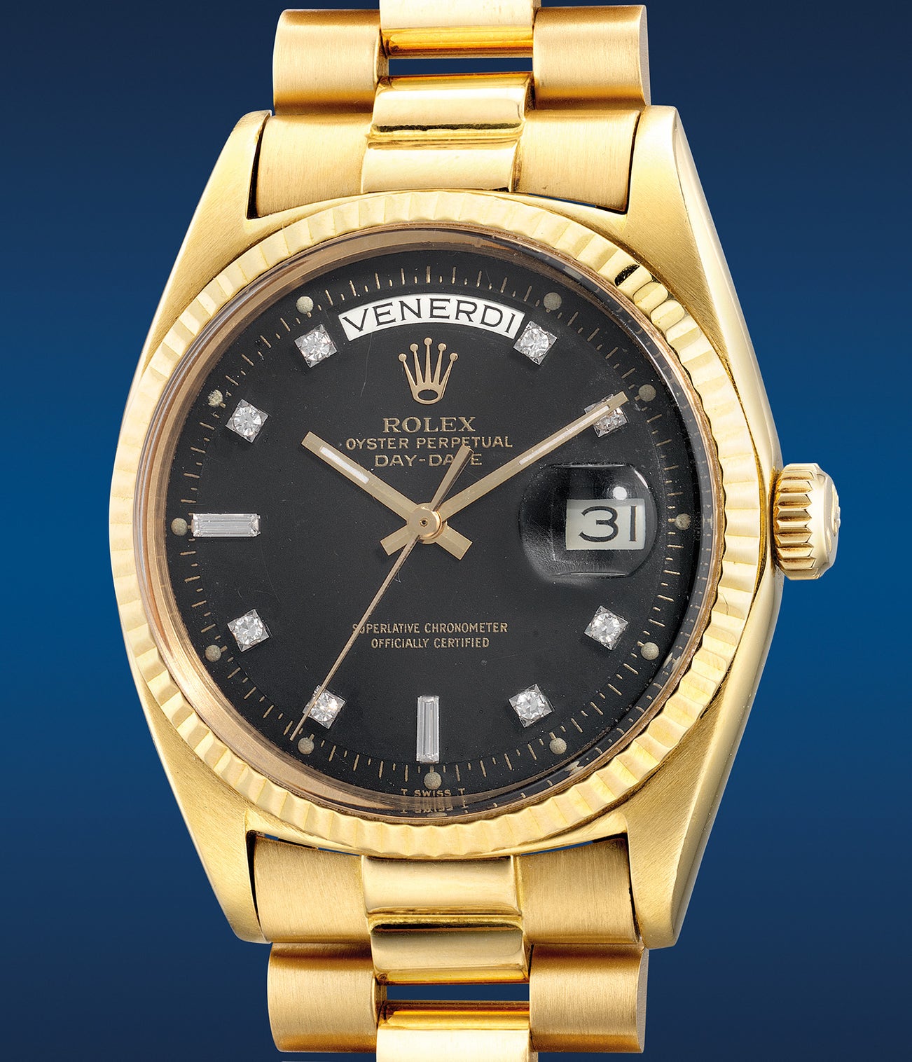 Released in the early 1960s, the ref. 1803 is a true icon of the Day-Date and to most collectors the title still stands today. The present example Rolex Day-Date ref. 1803 in yellow gold from circa 1970 with a 2.4 million serial features a rare and attractive matte black “pie-pan” dial with diamond-set indexes. Equipped with an Italian calendar, the present example originally sold through an Swiss Italian retailer is complete with its original guarantee and attestation. A rare gem to come across, black on yellow never goes wrong.
