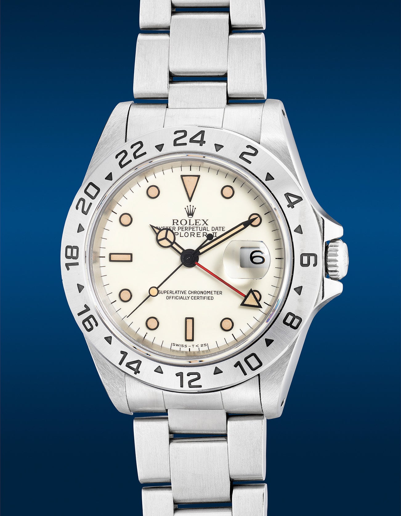 An attractive and rare stainless steel dual-time wristwatch with center seconds, date, 24-hour indication, ivory dial, bracelet and guarantee