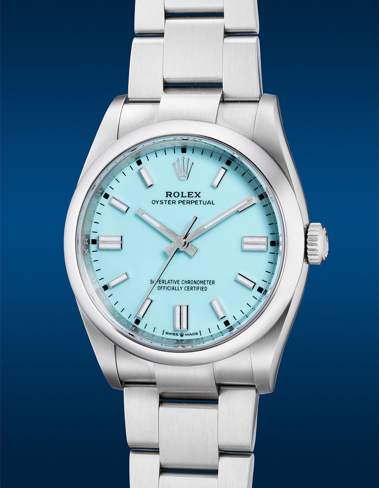 Featuring arguably the most desirable color amongst the selection in “Tiffany” blue, the present example is the 36mm variant offered by the original owner. Interestingly, this “Tiffany” blue Oyster Perpetual is unlike any other with a characteristic to notice. While the Oyster Perpetual is known to be certified with the chronometer certification indicated at 6 o’clock for excellence, a small detail or “mistake” on the typography on the “U” of Superlative appears slightly shorter than the rest of the text. Likely to be an oversight or known to the community as an “error” dial, this Oyster Perpetual certainly stands out from its peers. With the announcement just this spring of the discontinuation of the short lived "Tiffany" blue 41mm variant, the present Oyster Perpetual 36mm is still in production, but yet speculated for how much longer before its discontinuation. Presented in excellent overall condition example, this is a chance for collectors to acquire an unusual example right now.