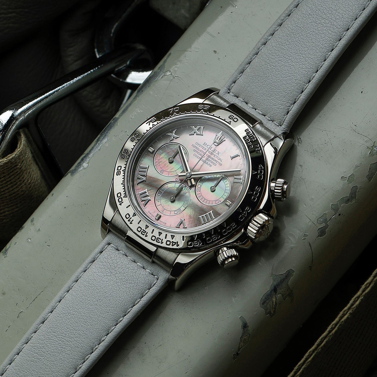 A rare and attractive white gold chronograph wristwatch with mother-of-pearl dial, guarantee and presentation box