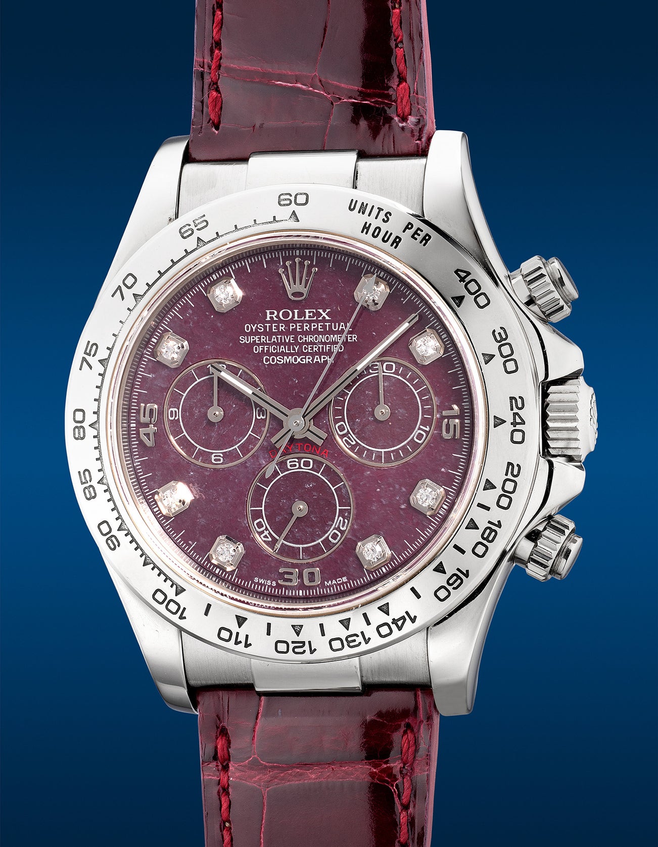 Offered in excellent overall condition, the present Rolex Cosmograph Daytona ref. 116519 offers a vivid red grossular rubellite garnet dial paired with diamond-set indexes, accompanied by a set of beautiful ruby red crocodile straps.
