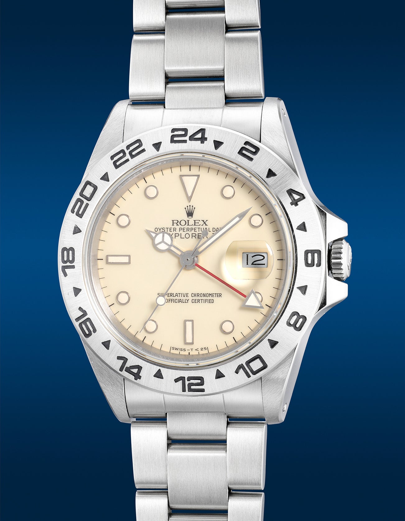 The present example Rolex Explorer II ref. 16550 from circa 1986 with a 9 million serial features the rare and desirable “cream” rail dial with applied white gold ringed luminous plots. Boasting an attractive and balanced patina as well as a sharp case, it is also blessed with its full set of accessories including its original invoice from 1986.