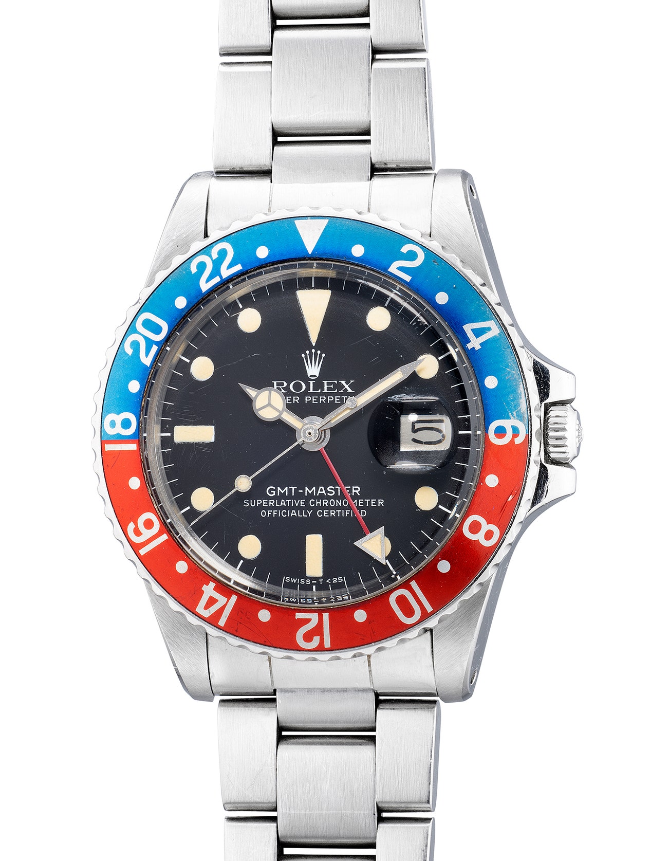 The present example Rolex GMT-Master ref. 1675 from circa 1978 with a 5.5 million serial features a MK V dial configuration identifiable by the alignment of the “M” from “MASTER” which sits right in between “CH” of “CHRONOMETER”. Offered in excellent overall condition with an attractive faded bezel insert is accompanied by its full set of accessories.