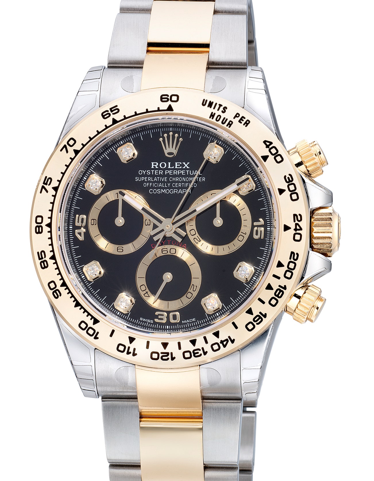 The present ref. 116503 features a black dial with diamond-set indexes, encased in Yellow Rolesor which is the firm’s patented combination of yellow gold alloy and stainless steel.