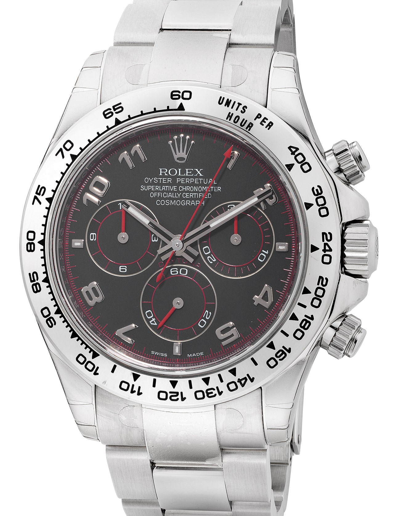 Hefty, steady and robust, the present Rolex Cosmograph Daytona ref. 116509 encased in 18K white gold with bracelet is certainly a luxurious touch to the renowned tool watch. Fitted with an attractive black dial with red accents and applied Arabic numerals, the dial is sporty and reflects the flying colors on the famous race track, Daytona circuit.