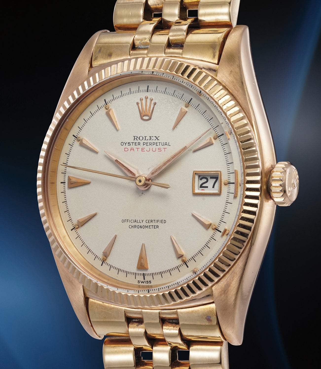 Preserved in excellent overall condition, the present Rolex Datejust reference 6305 in pink gold showcases strong proportions as well as a crisp and legible hallmark beneath the lug. Still retaining its original crown, the timepiece features an attractive creamy-white dial which has taken on a light layer of patina over time, further adding to the charm of the timepiece. The Jubilee bracelet is from the period and stamped from the fourth quarter of 1952. The red Datejust script and roulette date wheel are rare features of Datejusts from the 1950s and are correct for the serial number.