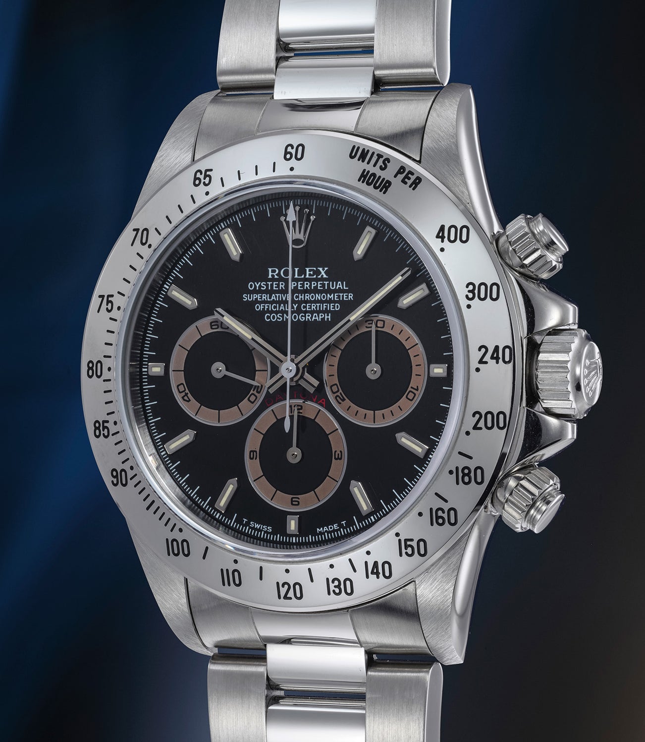 Bearing a “W” serial number from circa 1995, the watch falls into the rare batch of “tropical” dials. Its three registers have turned to a beautiful rich and chestnut brown colour. The type of lacquer applied during the manufacturing process has aged over time, and contributed to the unique “tropicalization” of certain S, T and W serial Daytonas' subsidiary dials, with W series being the "sweet spot" for tropical effects. Extremely rare as these imperfections are natural occurrences, such even and richly saturated colours extremely are desirable and scarce.