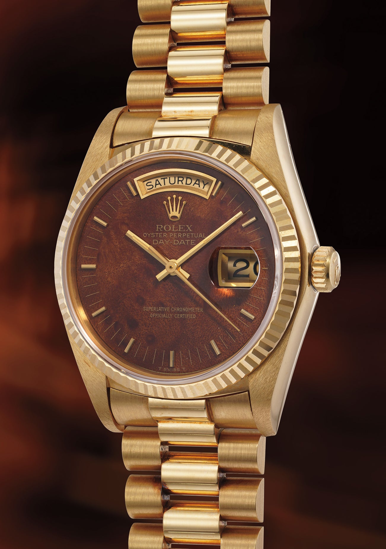 Showcasing a beautiful mahogany wood dial, the present Day-Date is truly captivating. Given that wood is a naturally occurring phenomenon, no two wood dials will be the same in appearance, giving it a unique identity. The overall excellent condition of the present timepiece further enhances its overall appeal. Displaying crisp and deep hallmarks to the bottom of the lugs, the caseback further retains its original factory sticker.