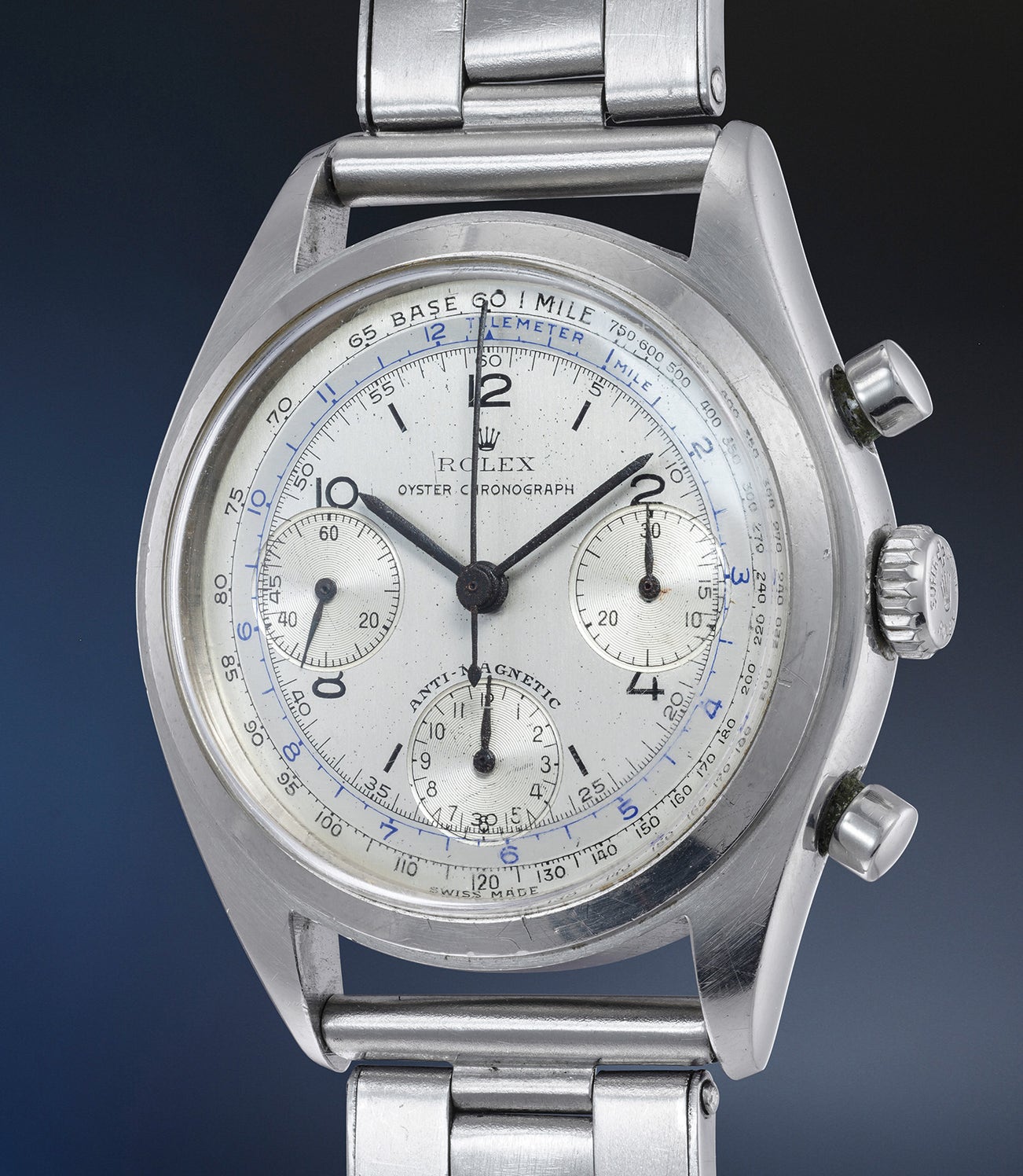 Indeed, the watch employs an Oyster case, paving the way to what would become one of the most popular designs of the 20th century: the coveted Cosmograph Daytona. Worth noting is that Rolex considered such a design an Oyster one - as mentioned on the dial - even though it lacks screw-down pushers. Only after their introduction of the ref. 6240 the would the pushers be considered a fundamental part of an Oyster case (and indeed 1970s ref. 6262 and 6264 with pump pushers do not usually bear the “Oyster” designation).