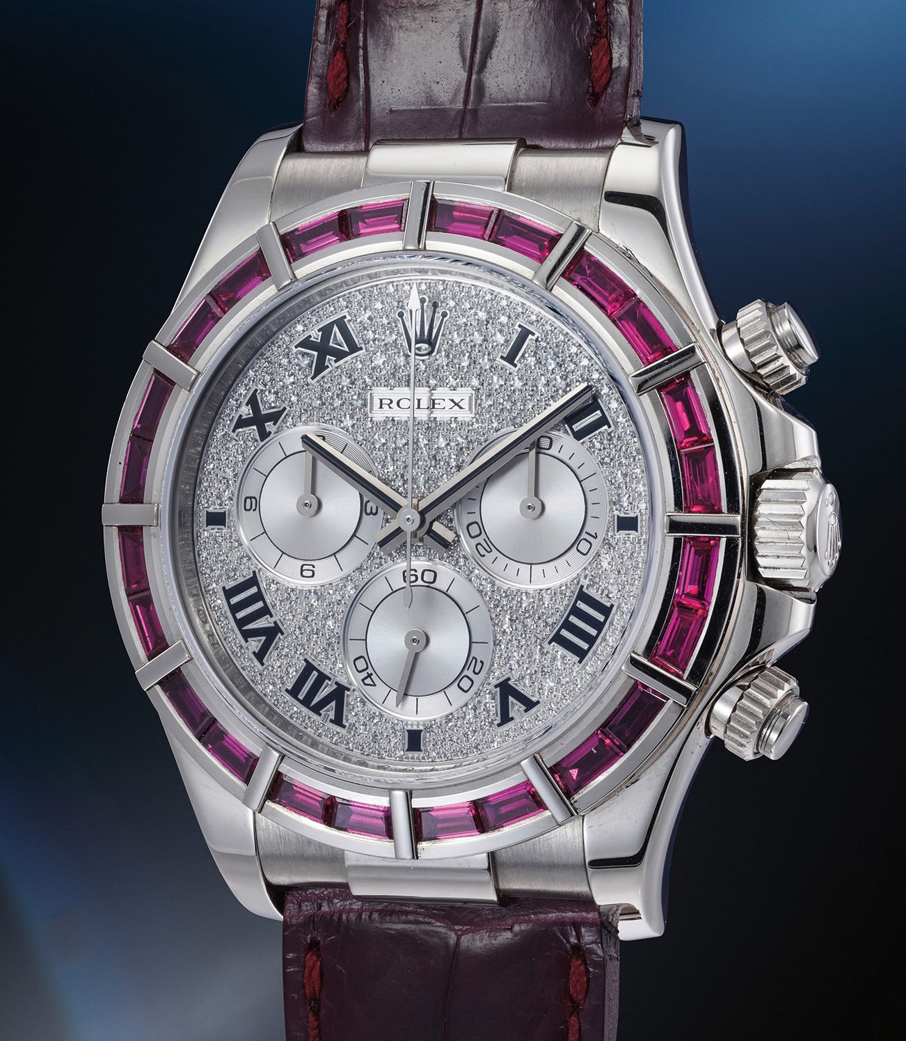 Heavy and luxurious, the present watch is fitted with a beautiful pavé diamond dial with Roman numerals, which has been preserved in excellent condition throughout the years. The bezel is also set with violet sapphires. Powered by the Rolex in-house caliber 4130, it is an incredible testament to Rolex's precision and flair for design.