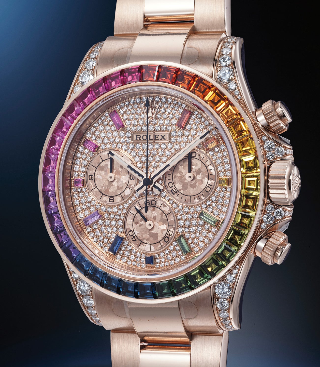 Aptly named the Rainbow, due to its lavish and impressive bezel carefully set with gemstones that graduate in hue to mimic the color spectrum, the tones range from a vibrant and intense deep red, and slowly morph to mauve, orange, chartreuse, green, blue and finally deep purple. The attention and precision on each "RBOW" is mind-boggling, every single sapphire and gemstone used is internally flawless and perfectly cut to fit without prongs into the bezel. The lugs are furthermore set with diamonds, to enhance the colourful nature of the watch. Due to the obvious difficulty in sourcing such flawless stones, the production numbers of such timepieces remains extremely low and across all metals, few have surfaced at auction.